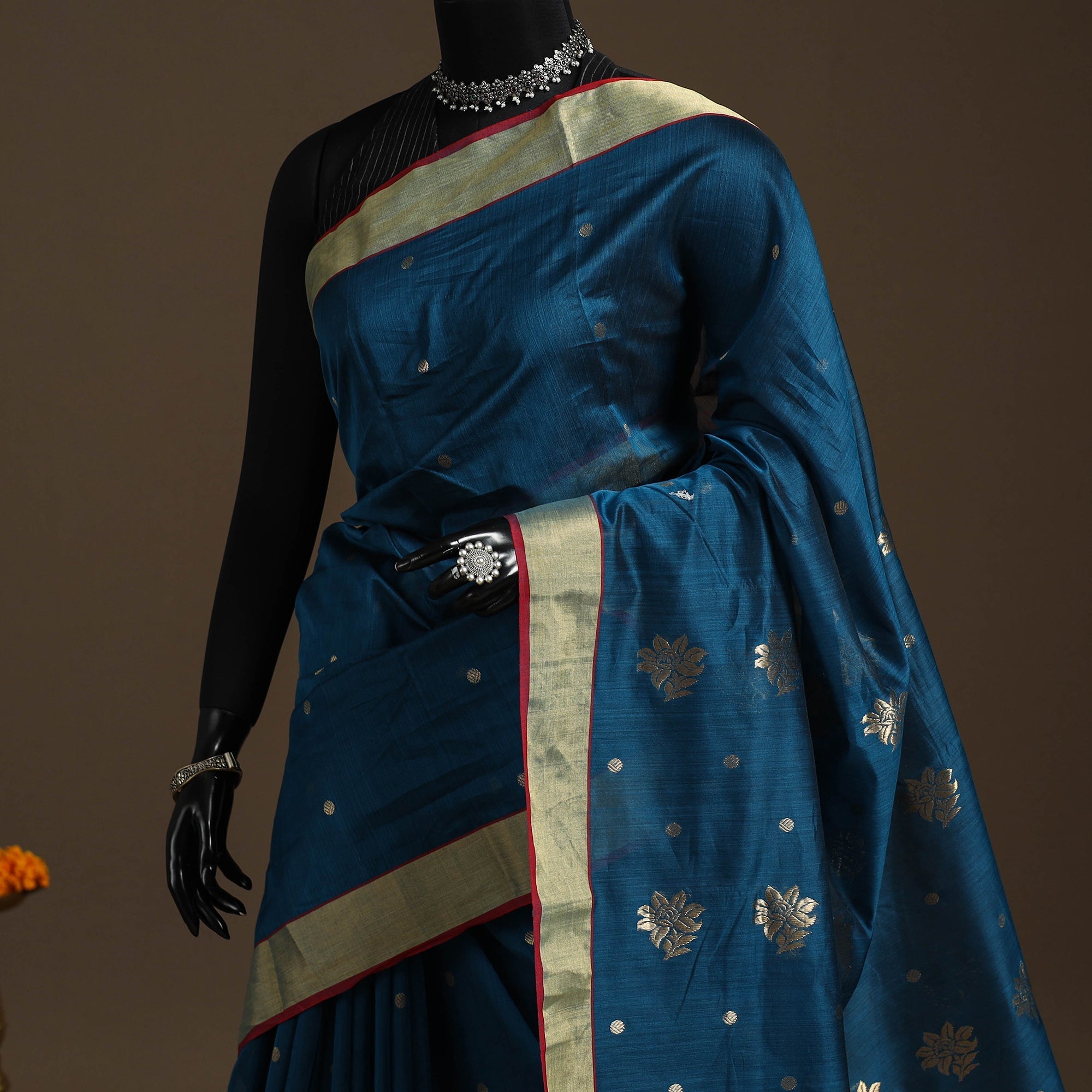 This blue chanderi saree is handwoven by skilled artisans in Chanderi, Madhya Pradesh. Made using a fine silk–cotton blend, it features delicately woven buttis created with separate needles, showcasing precision and traditional technique. The subtle sheen and zari border add an elegant, regal finish, making it a beautiful choice for festive events, weddings and special gatherings.