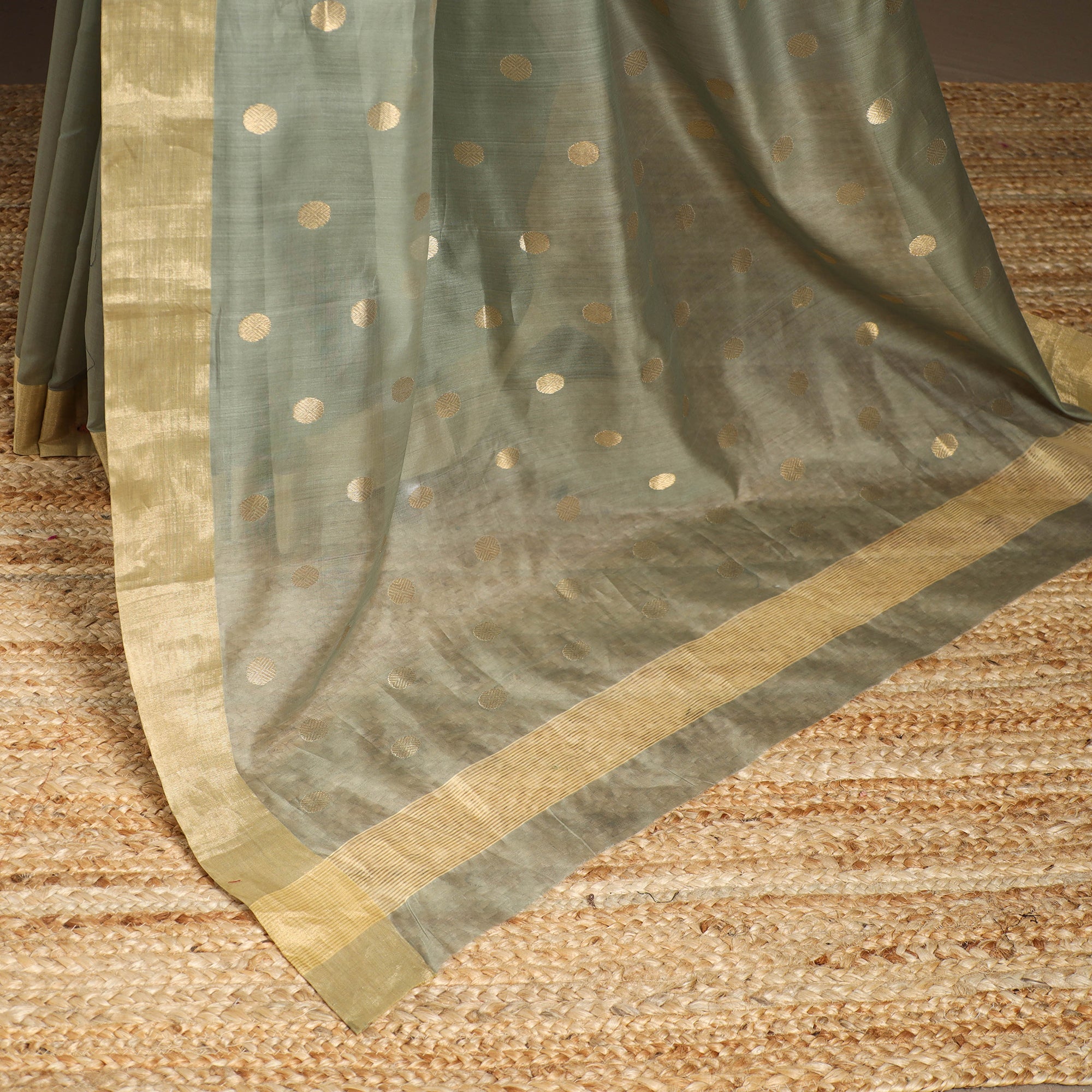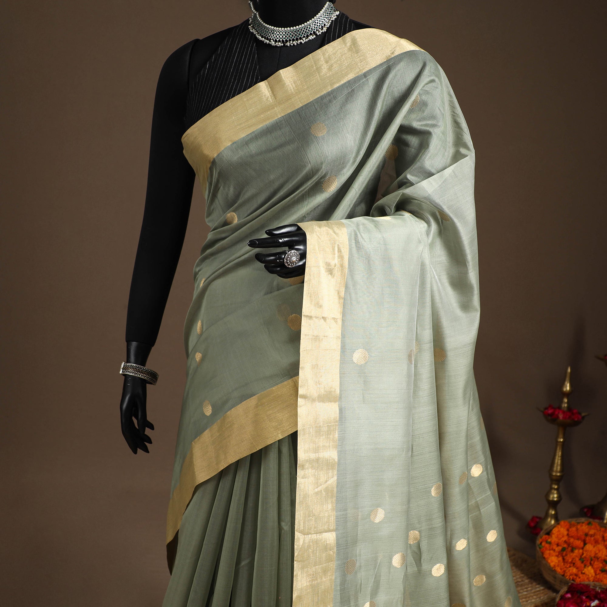 This elegant green chanderi silk saree is handwoven by skilled artisans from Chanderi, Madhya Pradesh. Crafted from a fine blend of silk and cotton, it showcases delicate buttis created with separate needles, reflecting both precision and tradition. The shimmering zari border lends a regal touch, making it an ideal choice for festive occasions, weddings, or graceful gatherings.