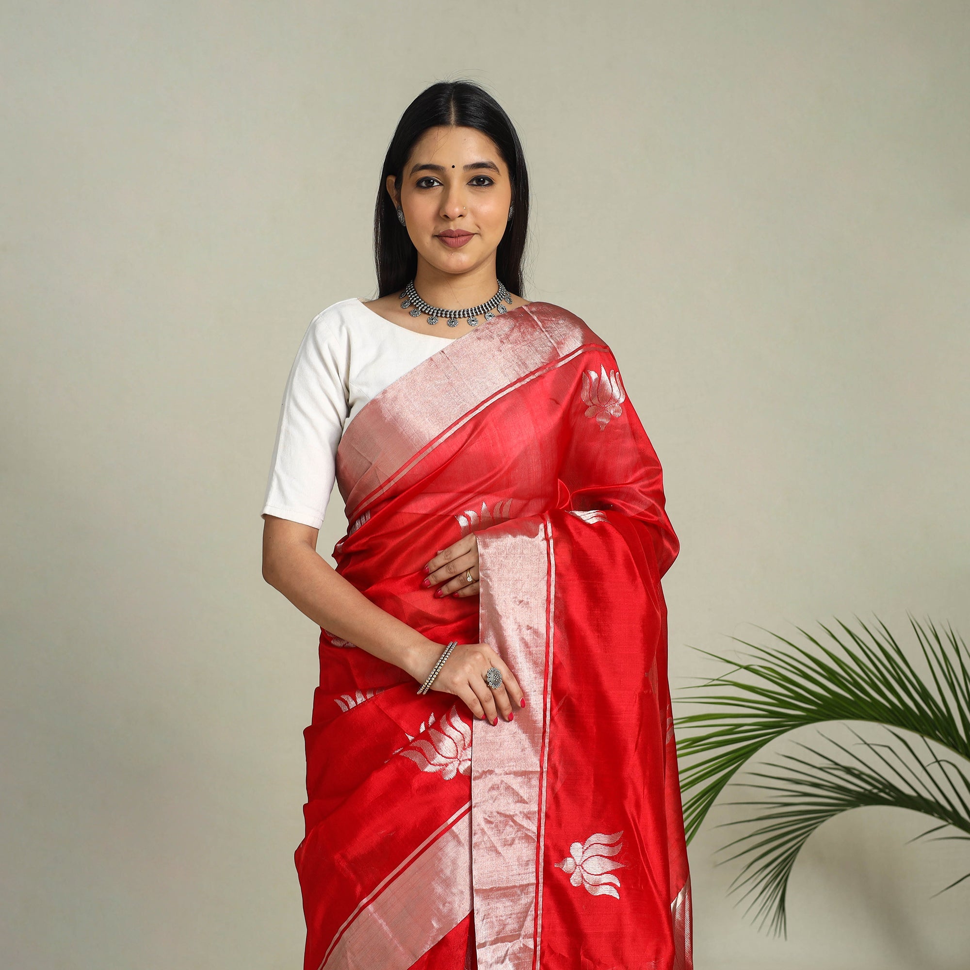 This traditional zari work red chanderi silk saree is handwoven by skilled artisans from Chanderi, Madhya Pradesh. It is crafted from a blend of Chanderi silk and mercerised cotton. The buttis or motifs on the Chanderi blend are carefully handwoven on the loom using needles. Each motif is created with a separate needle, showcasing fine craftsmanship. Known for its gossamer texture and elegant feel, the Chanderi silk saree is an ideal choice for special occasions or graceful gatherings.