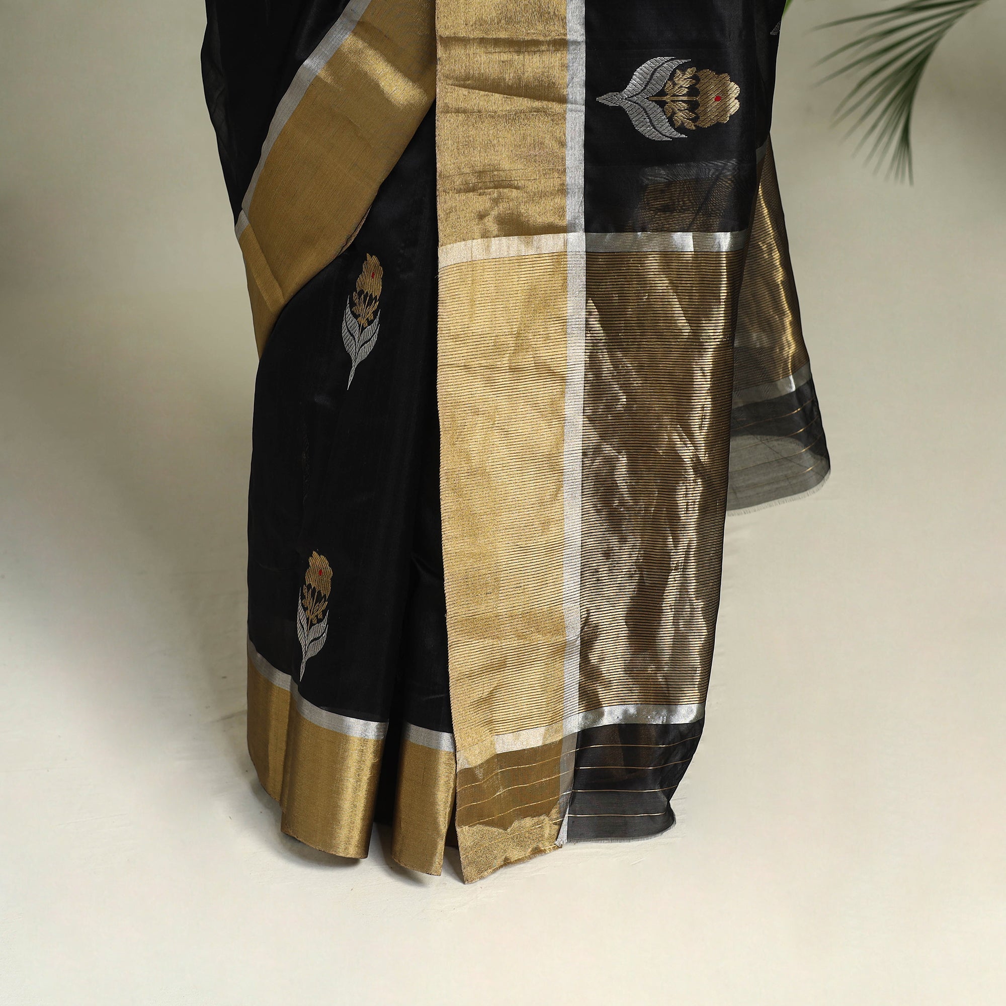 This traditional zari work black chanderi silk saree is handwoven by skilled artisans from Chanderi, Madhya Pradesh. It is crafted from a blend of Chanderi silk and mercerised cotton. The buttis or motifs on the Chanderi blend are carefully handwoven on the loom using needles. Each motif is created with a separate needle, showcasing fine craftsmanship. Known for its gossamer texture and elegant feel, the Chanderi silk saree is an ideal choice for special occasions or graceful gatherings.