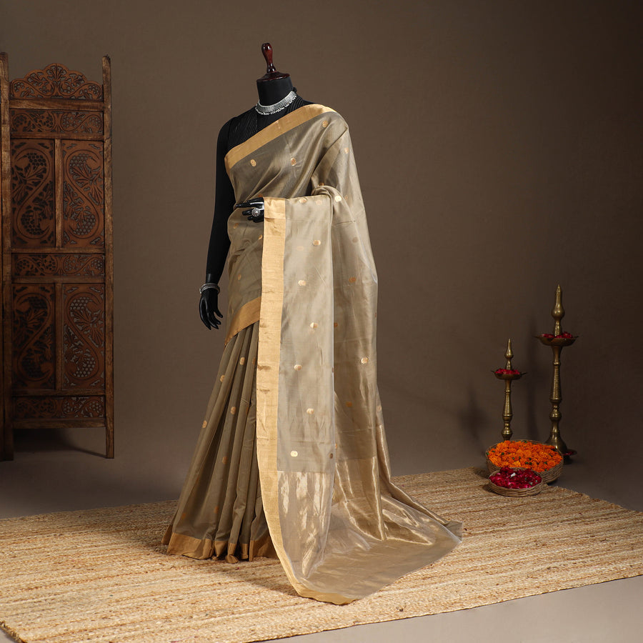 This elegant brown chanderi silk saree is handwoven by skilled artisans from Chanderi, Madhya Pradesh. Crafted from a fine blend of silk and cotton, it showcases delicate buttis created with separate needles, reflecting both precision and tradition. The shimmering zari border lends a regal touch, making it an ideal choice for festive occasions, weddings, or graceful gatherings.