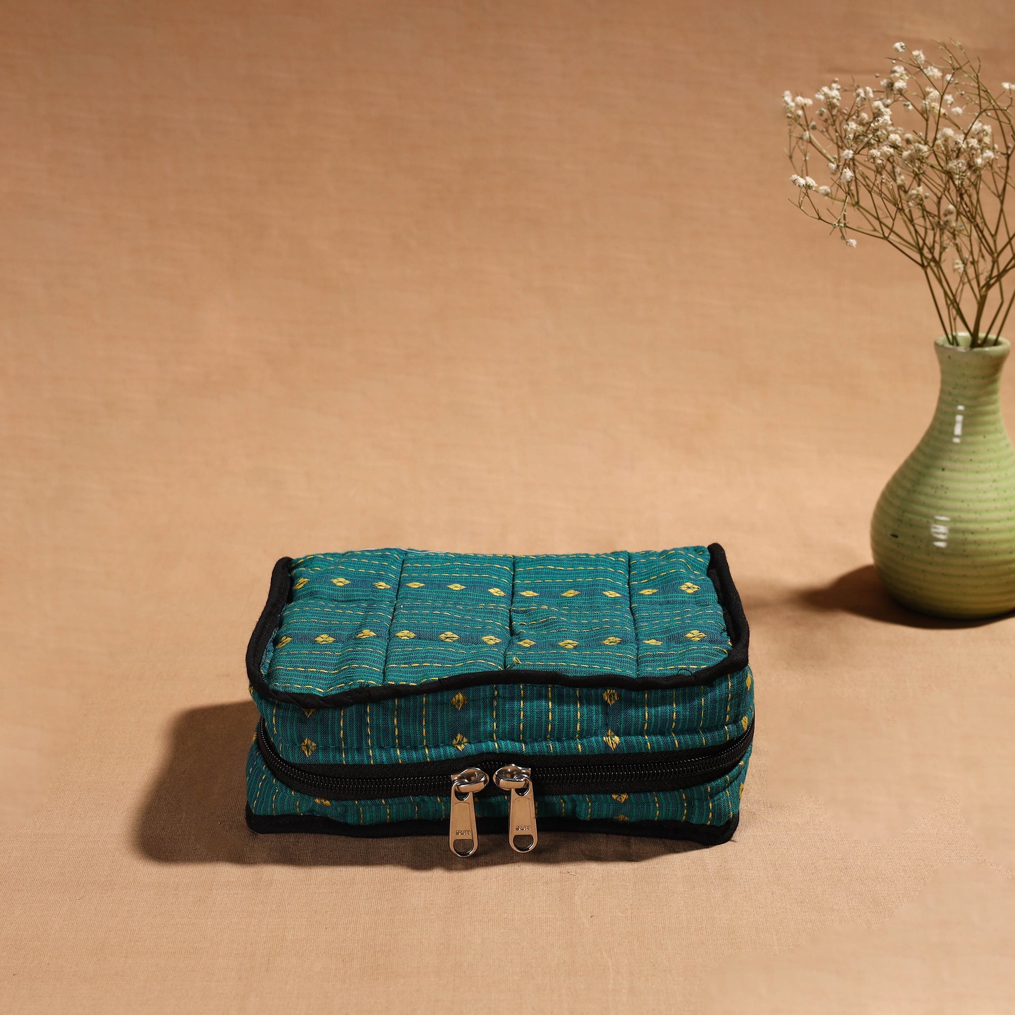 Green handmade 4 pockets cotton jewellery bag, an eco-friendly solution crafted by skilled artisans. This bag offers ample space to organize your precious jewellery, with four spacious pockets and a soft cotton texture.