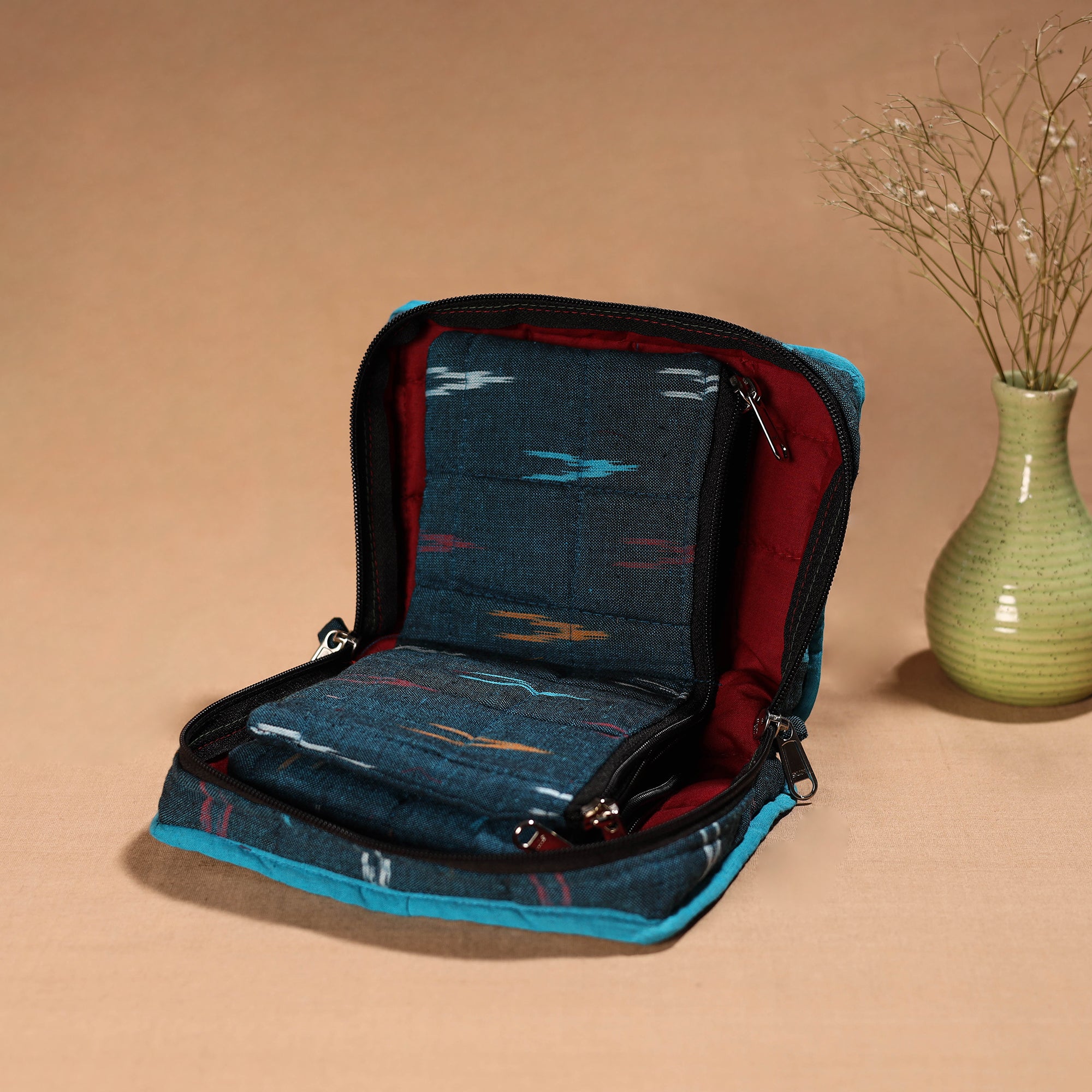 | Material | Organize your jewellery in style with this blue handmade 4 pockets cotton jewellery bag. This bag offers ample space to organize your precious jewellery, with four spacious pockets and a soft cotton texture. this jewellery bag is both functional and sustainable, making it a perfect travel companion or home organizer. |