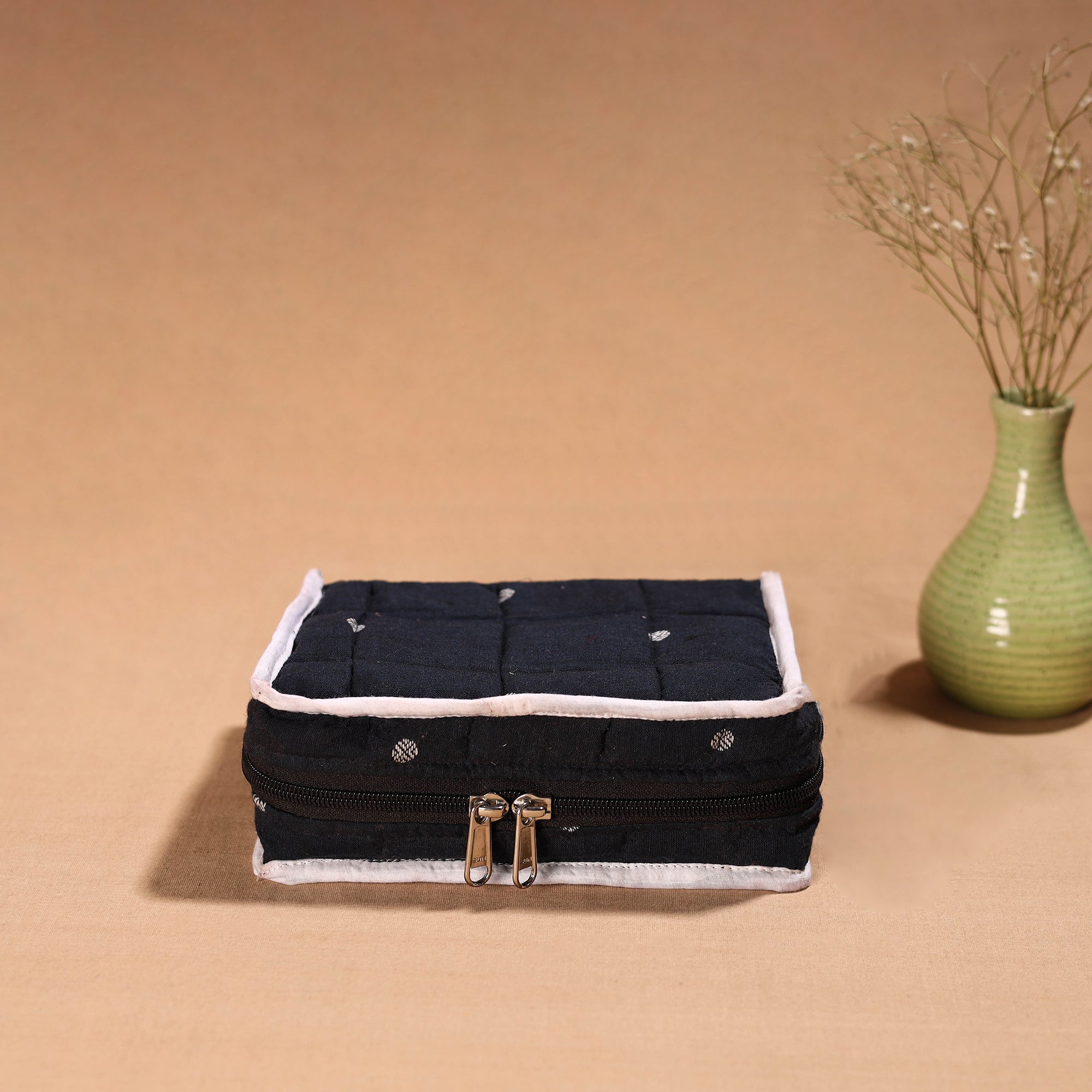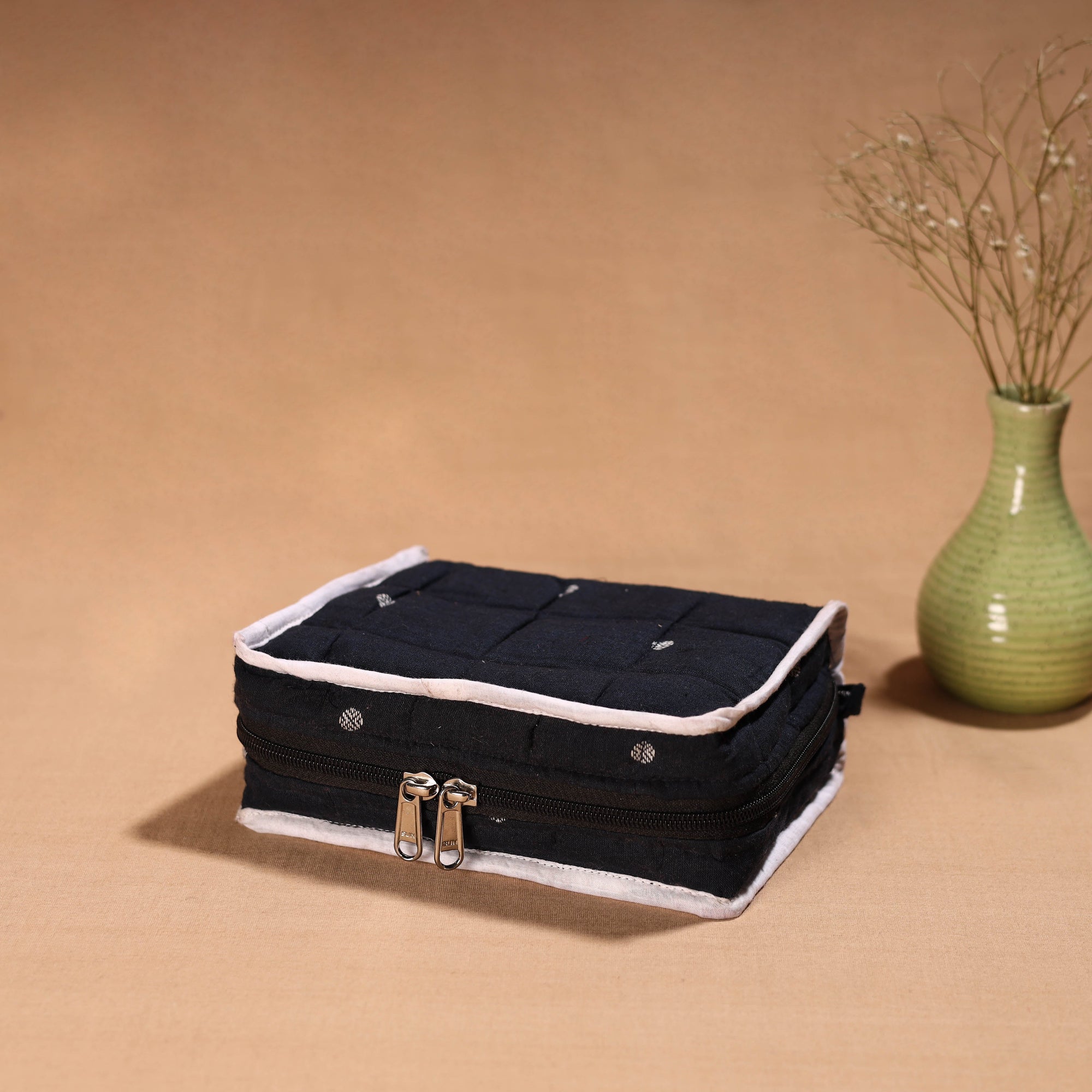 Organize your jewellery in style with this black handmade 4 pockets cotton jewellery bag. This bag offers ample space to organize your precious jewellery, with four spacious pockets and a soft cotton texture. this jewellery bag is both functional and sustainable, making it a perfect travel companion or home organizer.