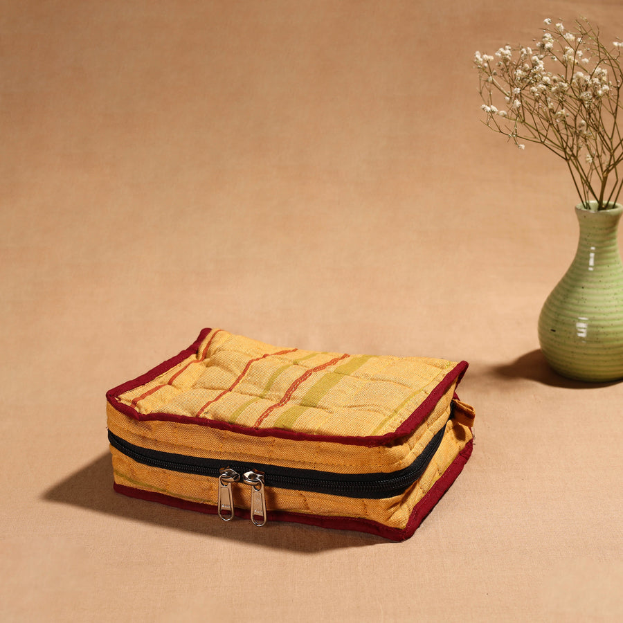 Material Yellow handmade 4 pockets cotton jewellery bag, an eco-friendly solution crafted by skilled artisans. This bag offers ample space to organize your precious jewellery, with four spacious pockets and a soft cotton texture.