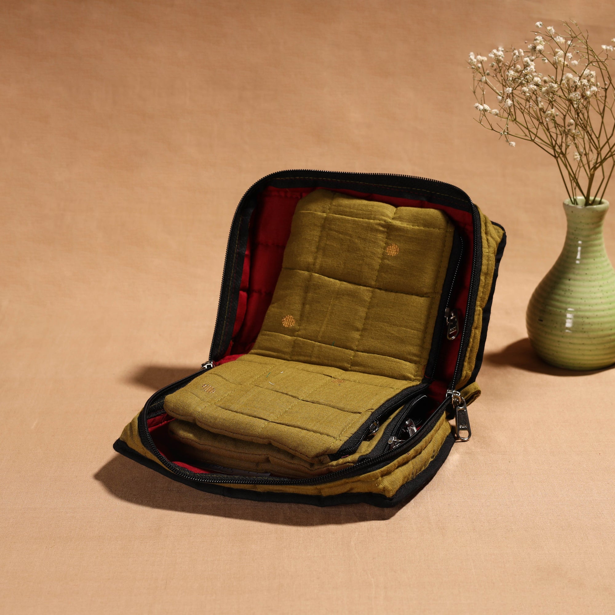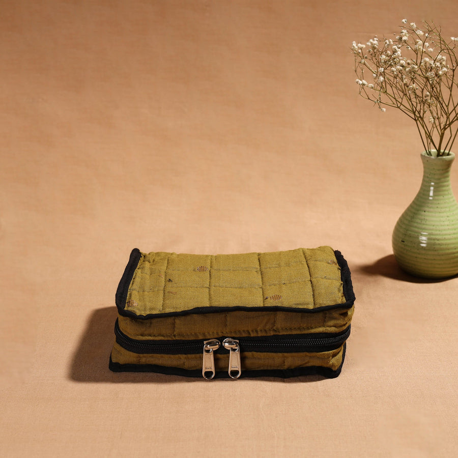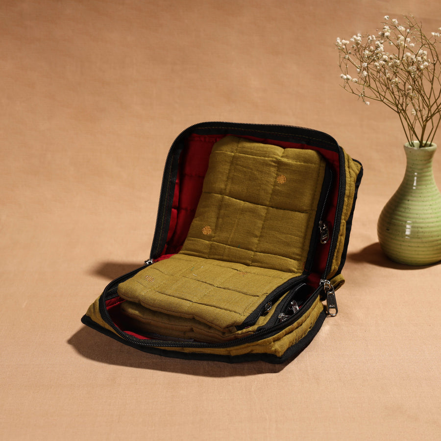 Green handmade 4 pockets cotton jewellery bag, an eco-friendly solution crafted by skilled artisans. This bag offers ample space to organize your precious jewellery, with four spacious pockets and a soft cotton texture.