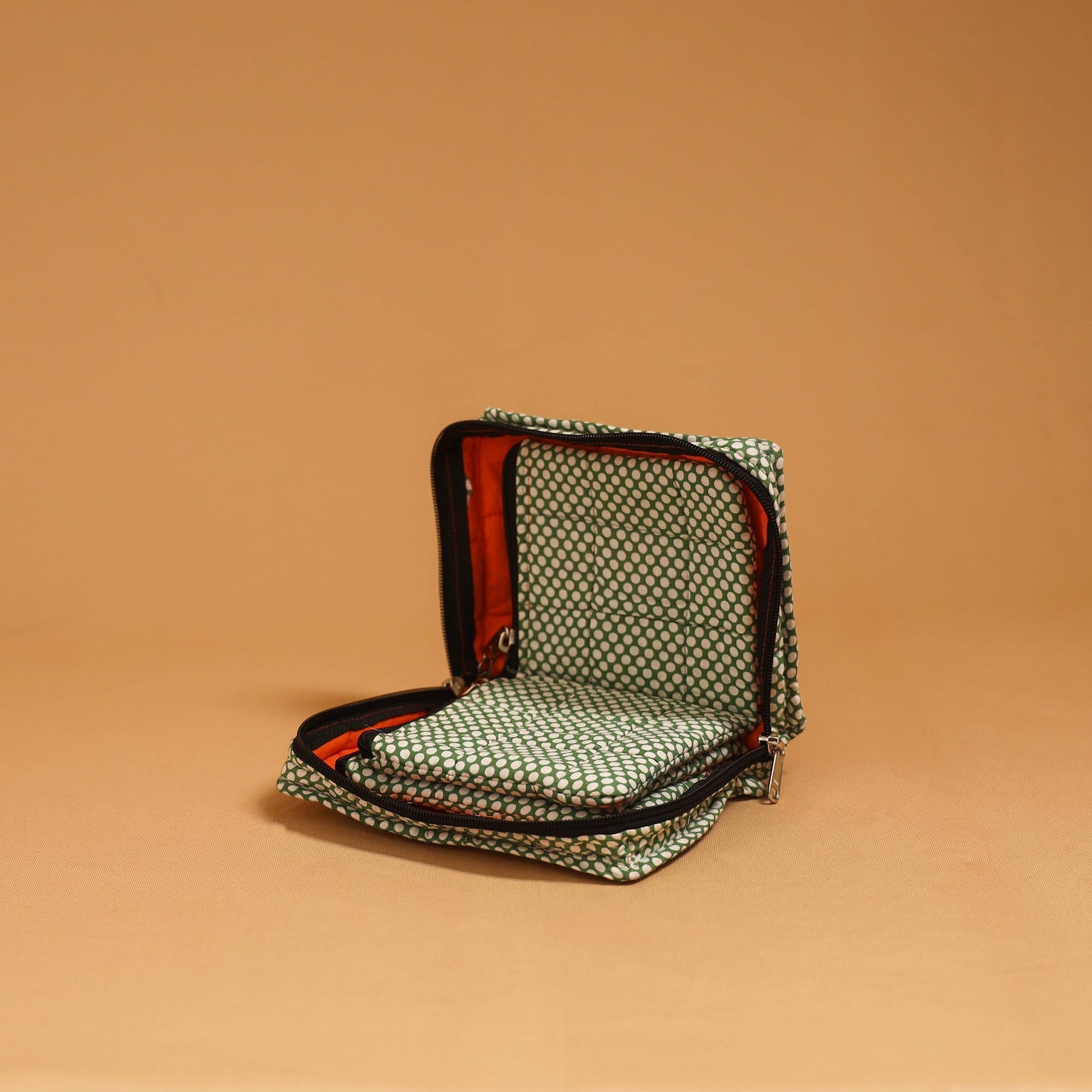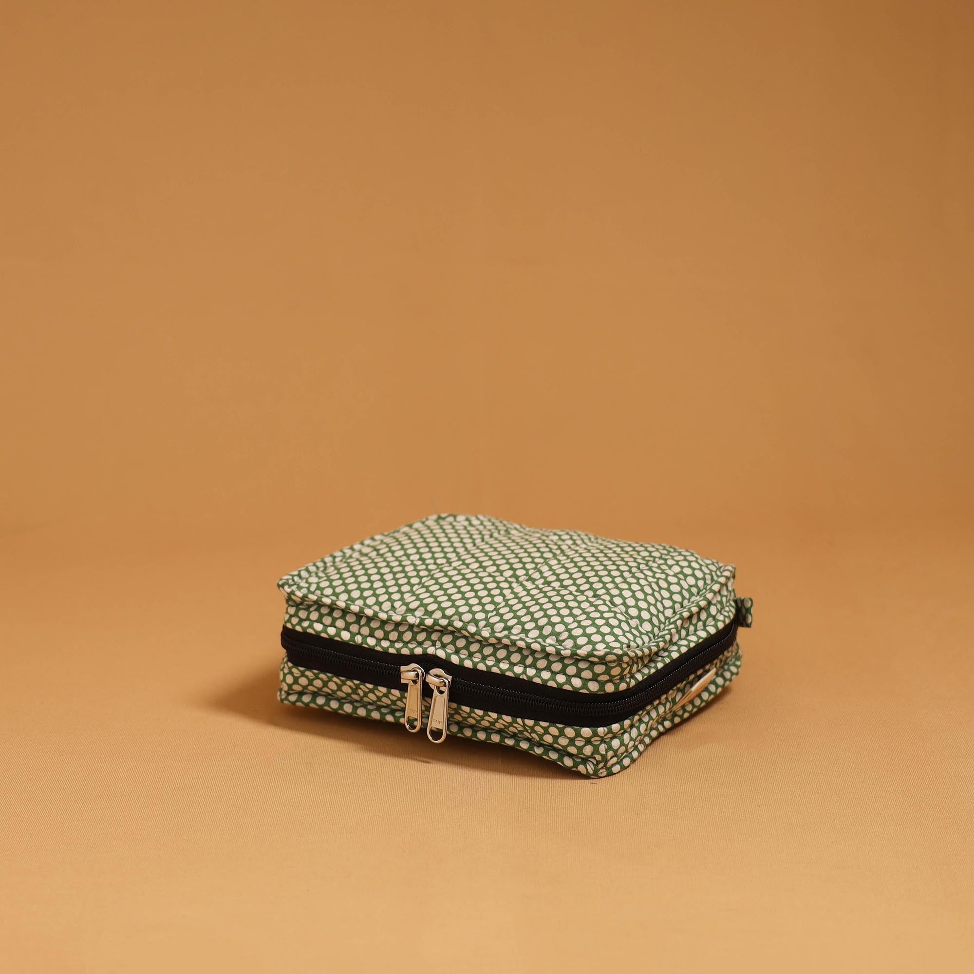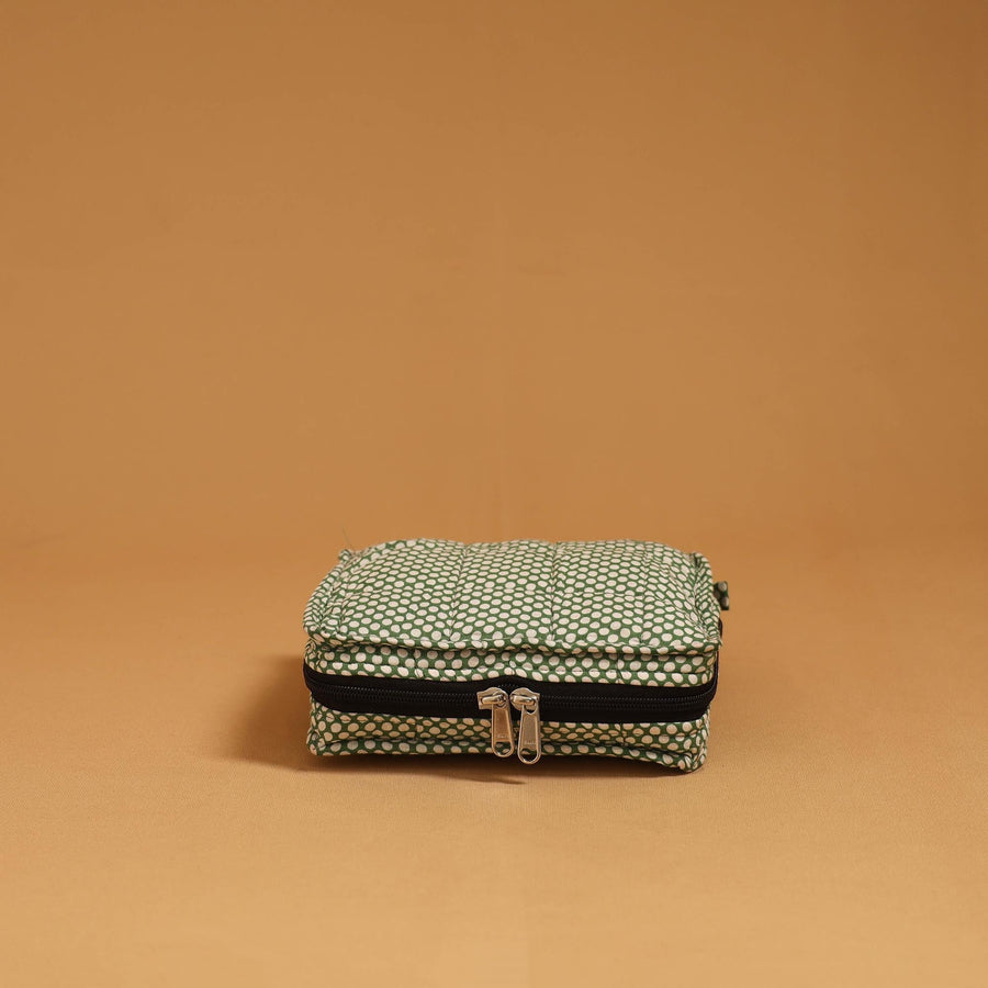 | Material | Green quilted jewellery bag is made using Indian handmade textiles for keeping jewellery safe and organised, this quilted jewellery organiser is designed for both convenience and elegance. Thoughtfully crafted with multiple compartments and secure closure, it ensures that your accessories remain tangle-free and protected. |