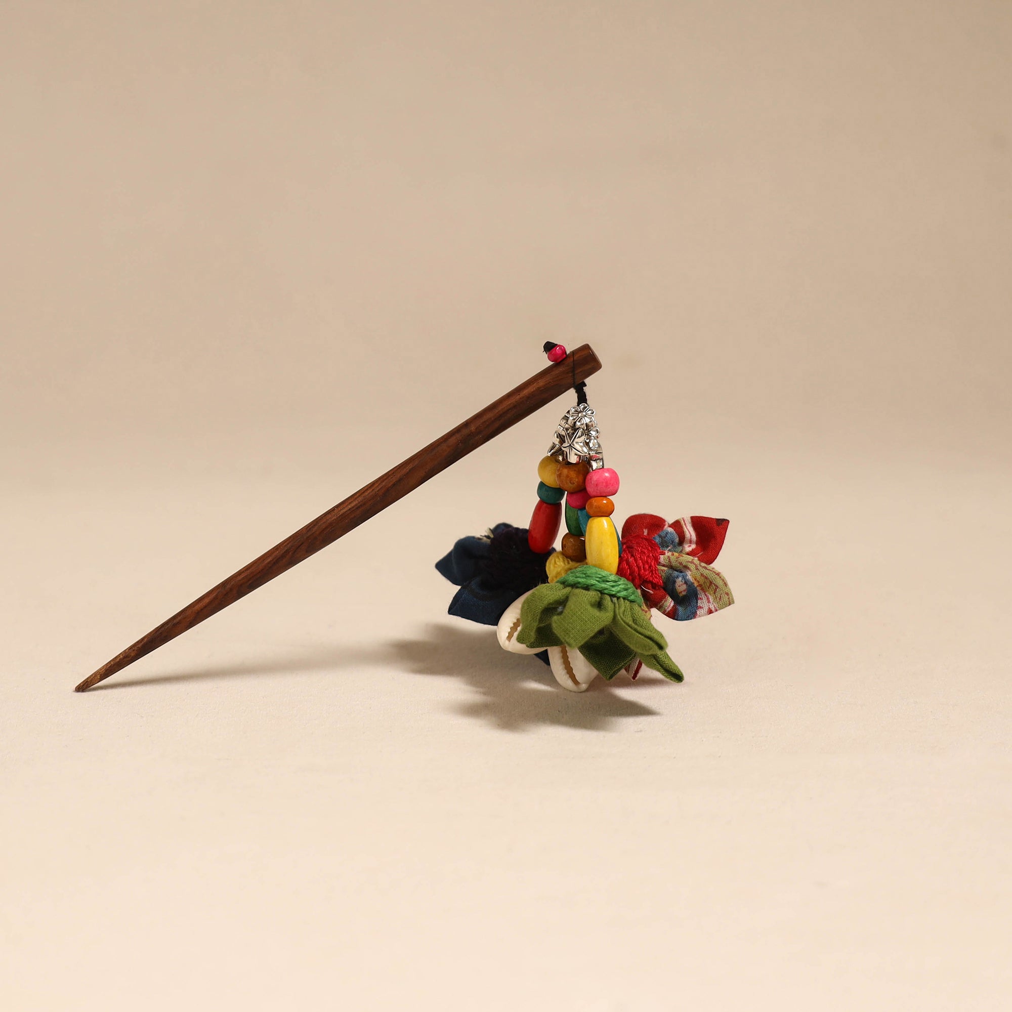 Handmade juda stick adds a graceful touch to your hairstyle. Made with a wooden base, it features intricate artistic details that may include beads, threadwork, german silver, fabric phool kali, shells or other decorative elements, reflecting the unique creativity of the maker.