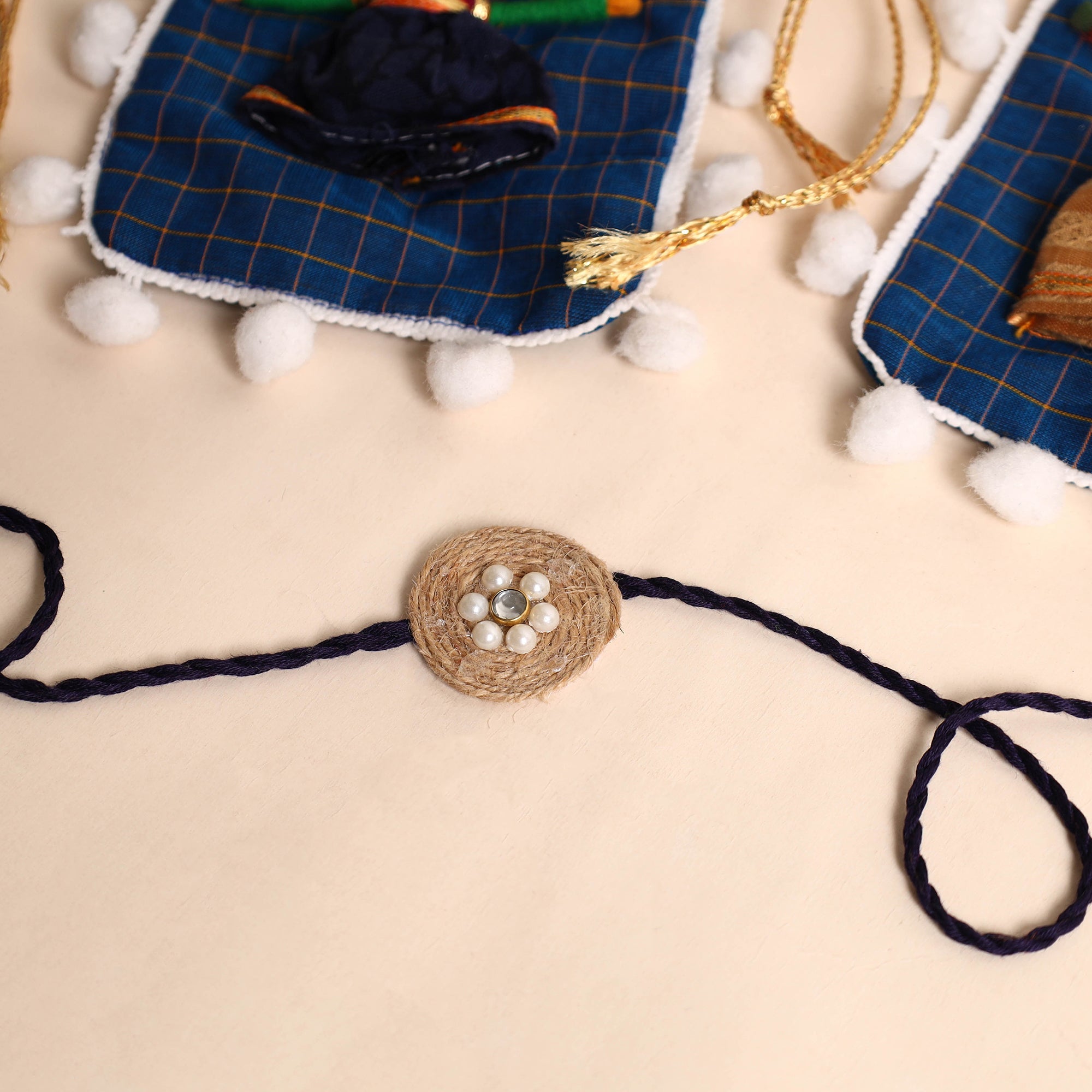 Celebrate the joyous festival of raksha bandhan with our exquisite handmade jute rakhi. Carefully handcrafted with intricate bead and mirror work, this rakhi is a true symbol of love and affection shared between a brother and sister. It comes beautifully packed in a charming potli, adding an extra touch of elegance.