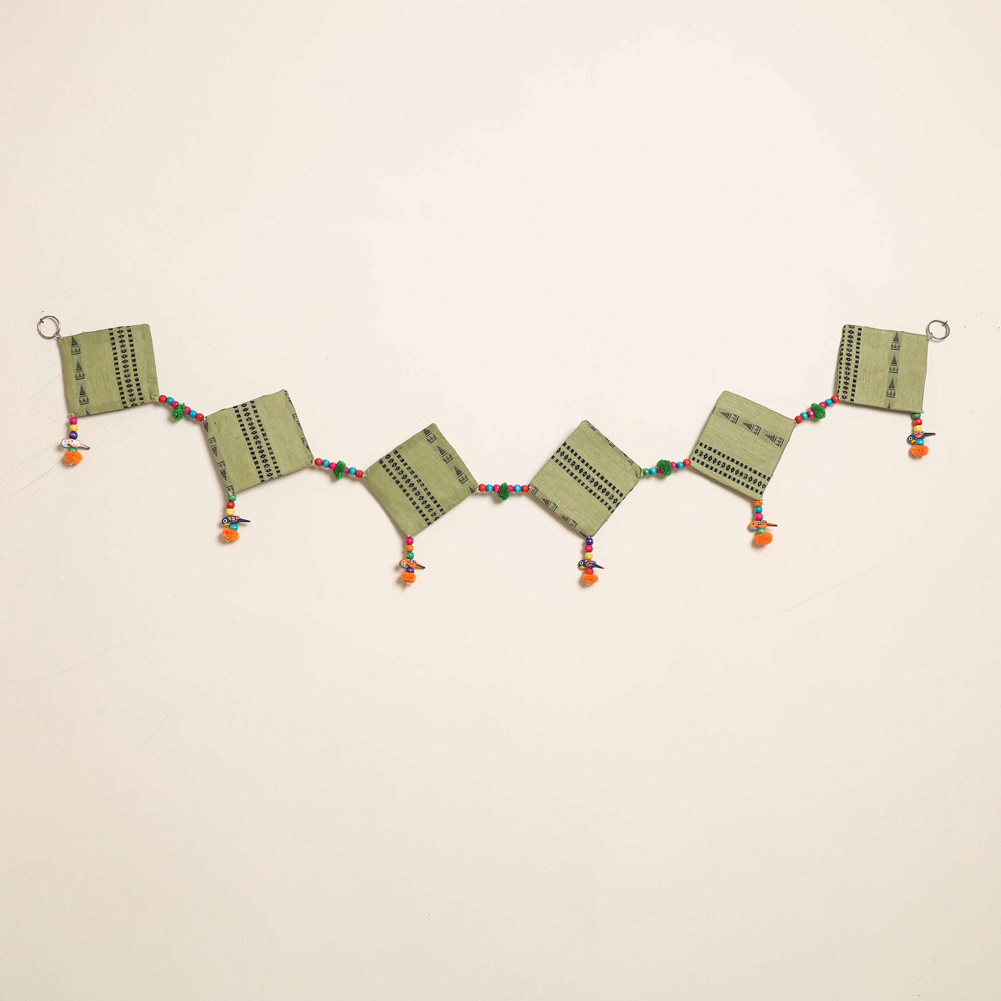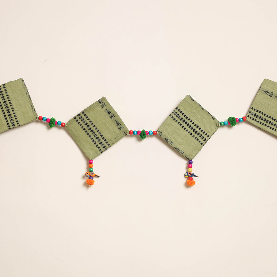 This handmade toran for home decor is crafted from fabric and adorned with intricate wooden beadwork and pompoms. Designed by skilled artisans, it brings festive and cultural charm to your doorways a perfect piece to celebrate traditional Indian aesthetics in everyday spaces.