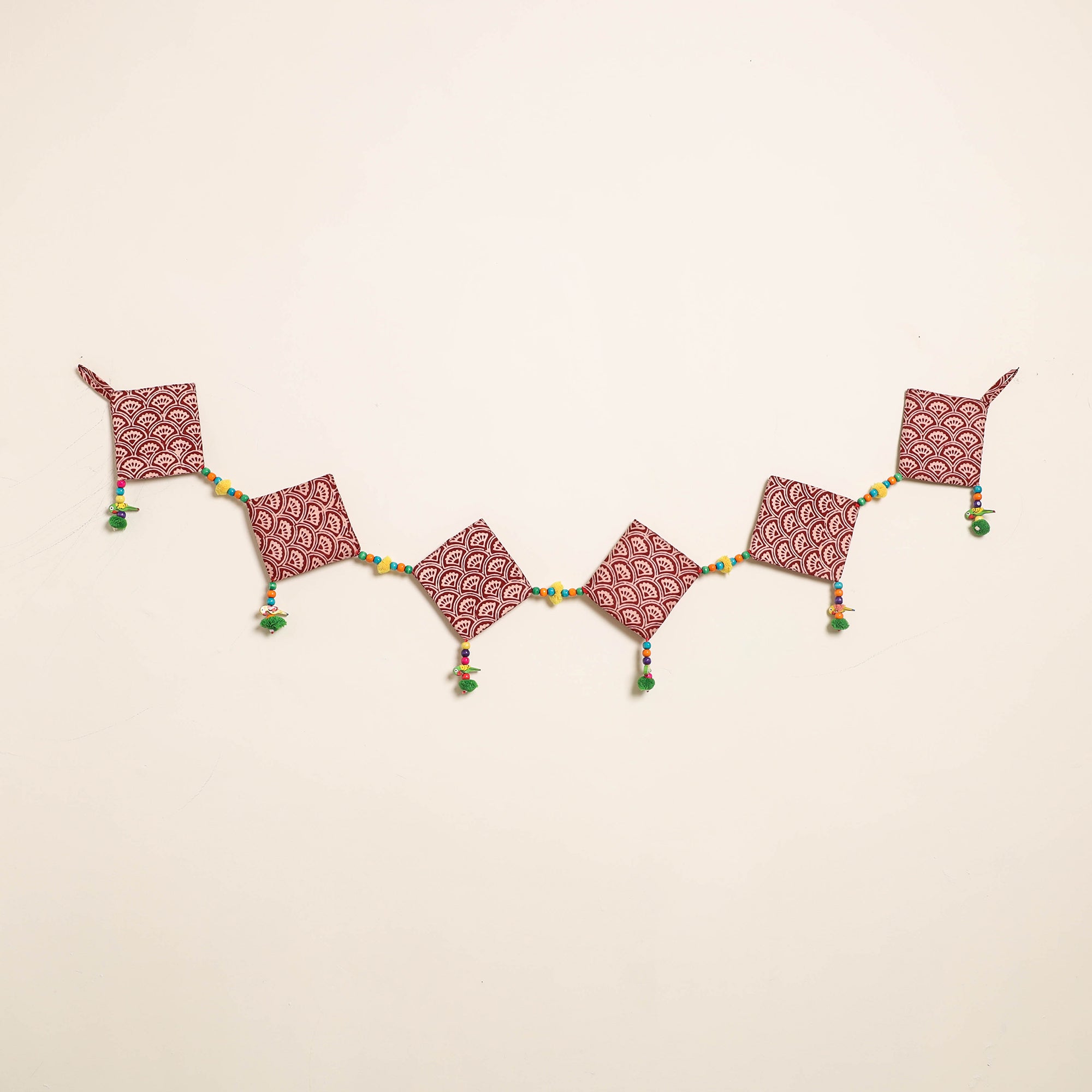 This handmade toran for home decor is crafted from fabric and adorned with intricate wooden beadwork and pompoms. Designed by skilled artisans, it brings festive and cultural charm to your doorways a perfect piece to celebrate traditional Indian aesthetics in everyday spaces.