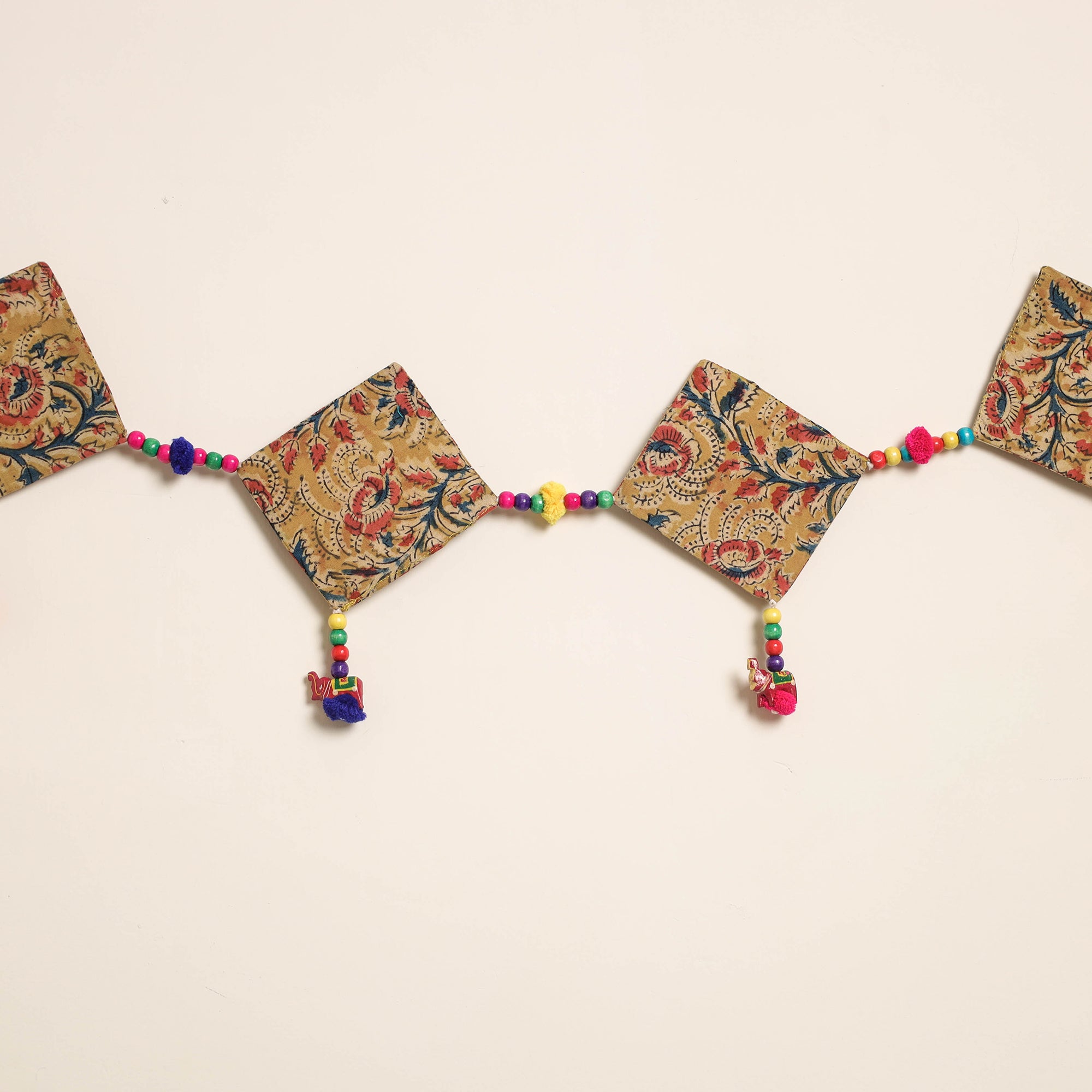 This handmade toran for home decor is crafted from fabric and adorned with intricate wooden beadwork and pompoms. Designed by skilled artisans, it brings festive and cultural charm to your doorways a perfect piece to celebrate traditional Indian aesthetics in everyday spaces.
