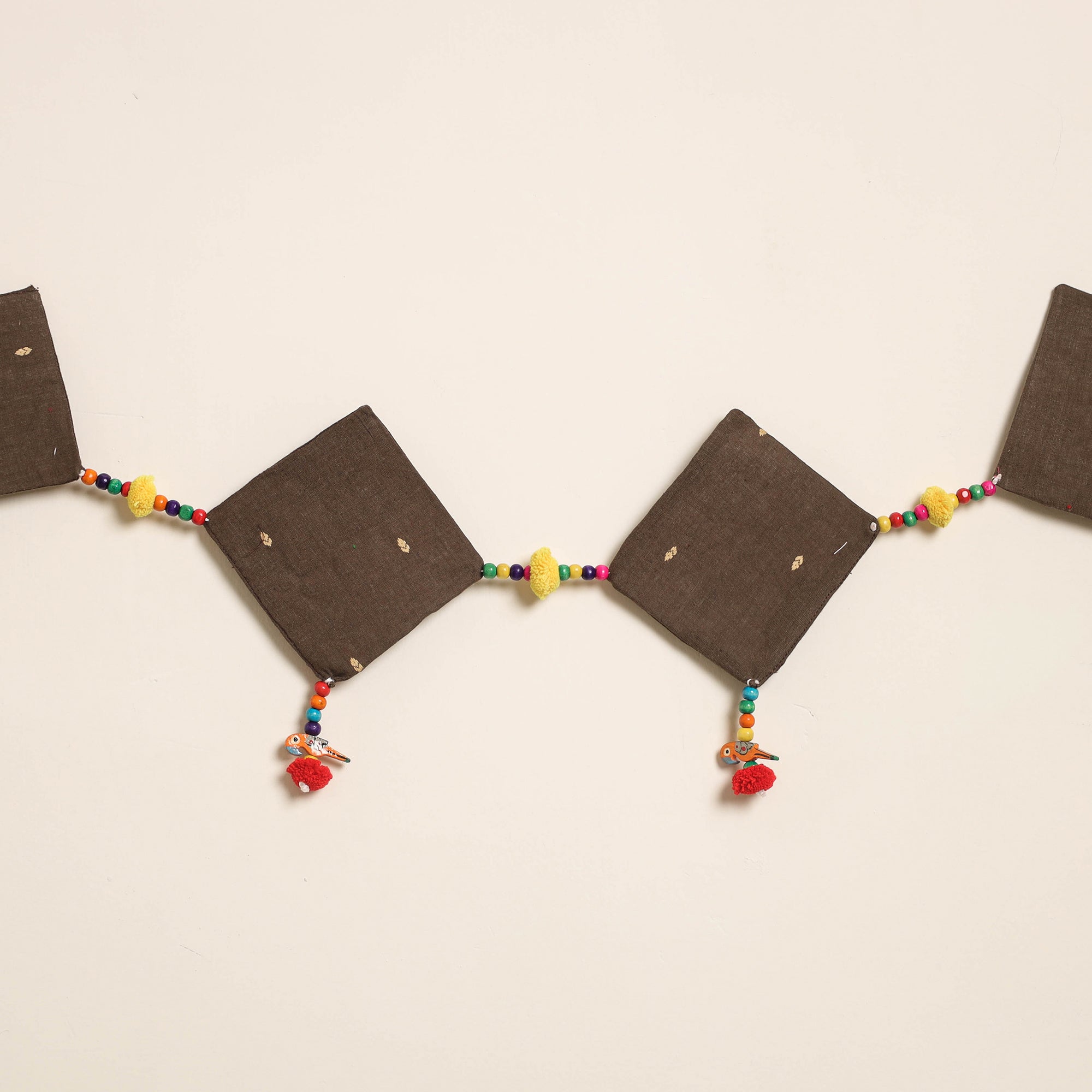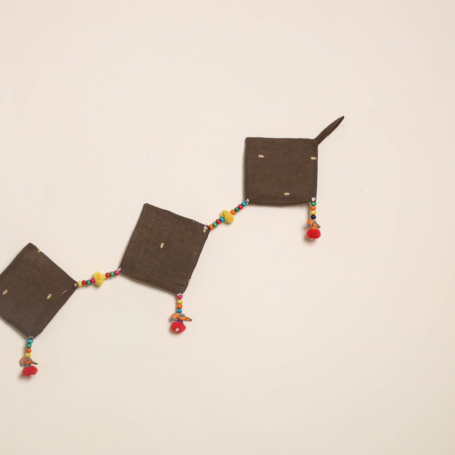 This handmade toran for home decor is crafted from fabric and adorned with intricate wooden beadwork and pompoms. Designed by skilled artisans, it brings festive and cultural charm to your doorways a perfect piece to celebrate traditional Indian aesthetics in everyday spaces.