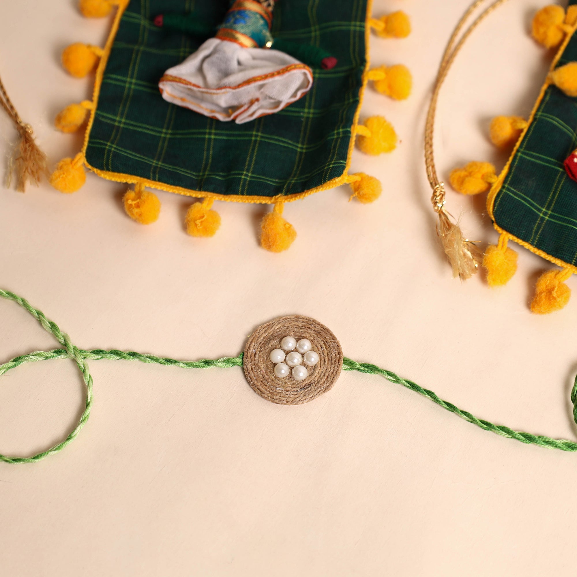 Celebrate the joyous festival of raksha bandhan with our exquisite handmade jute rakhi. Skillfully handcrafted with intricate bead work, this rakhi is a true symbol of love and affection between brother and sister. This rakhi will come with a potli for added charm.