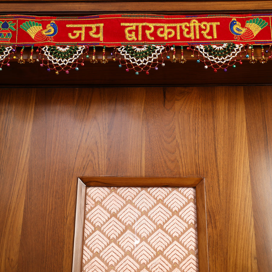 This handmade bead work kutch embroidery toran is the perfect accessory for your home’s entrance. Made with intricate beads, zari and thead work. Perfect for decorating your doorways, especially during festivals like Diwali. Kutch embroidery, is an art form from Gujarat, reflects India’s rich embroidery traditions.