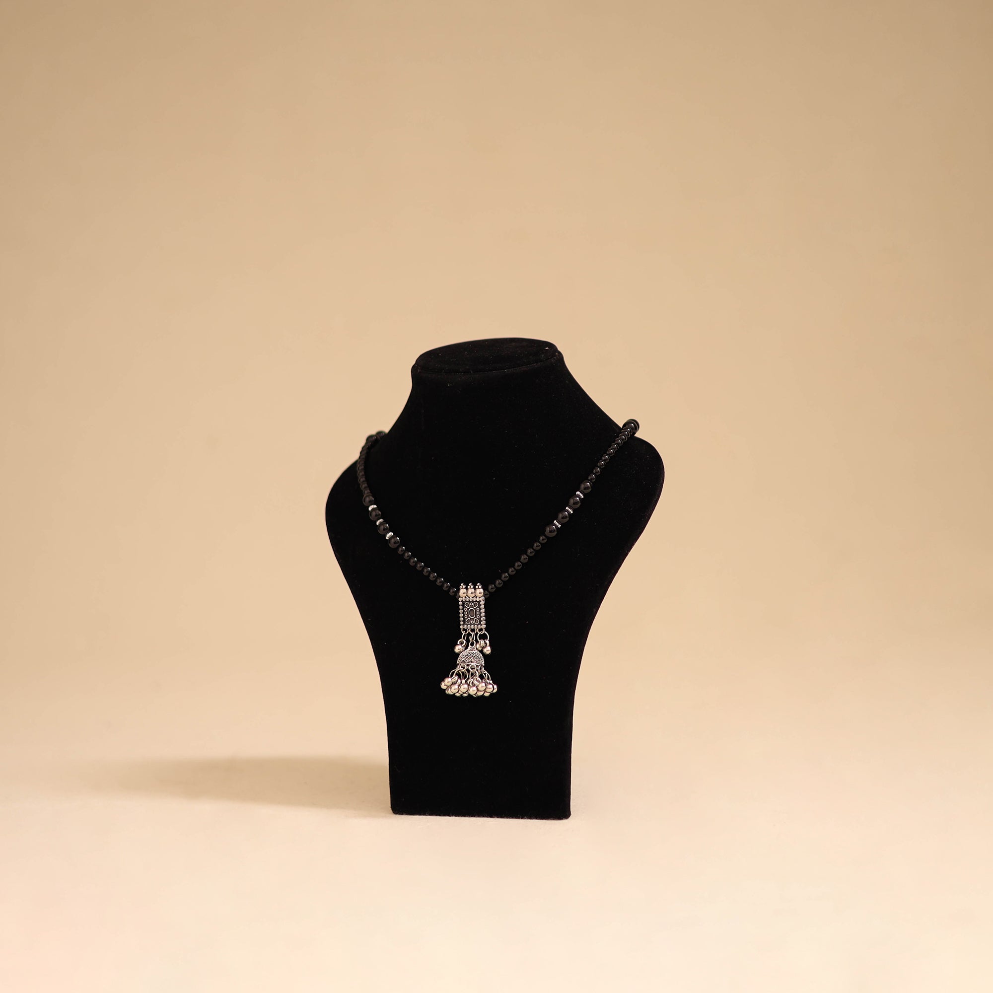 This black beadwork pendant necklace is handmade by skilled artisans using traditional techniques. Its intricate detailing combines timeless design with a modern touch, making it perfect for festive occasions as well as everyday wear. Lightweight and graceful, it adds charm to any outfit and is an ideal choice for those who value unique, handcrafted accessories.
