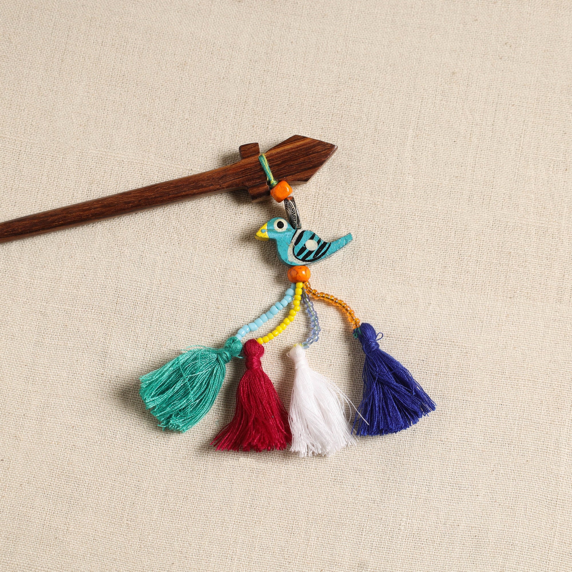 This bird tassel brown juda stick adds a graceful, eye-catching touch to your hairstyle. Made using a wooden base, it features intricate artisan-made details that may include beads, thread work, a hand-painted bird or other decorative elements, reflecting the unique creativity of the maker. Perfect for festive looks, wedding hairstyles or even everyday styling.