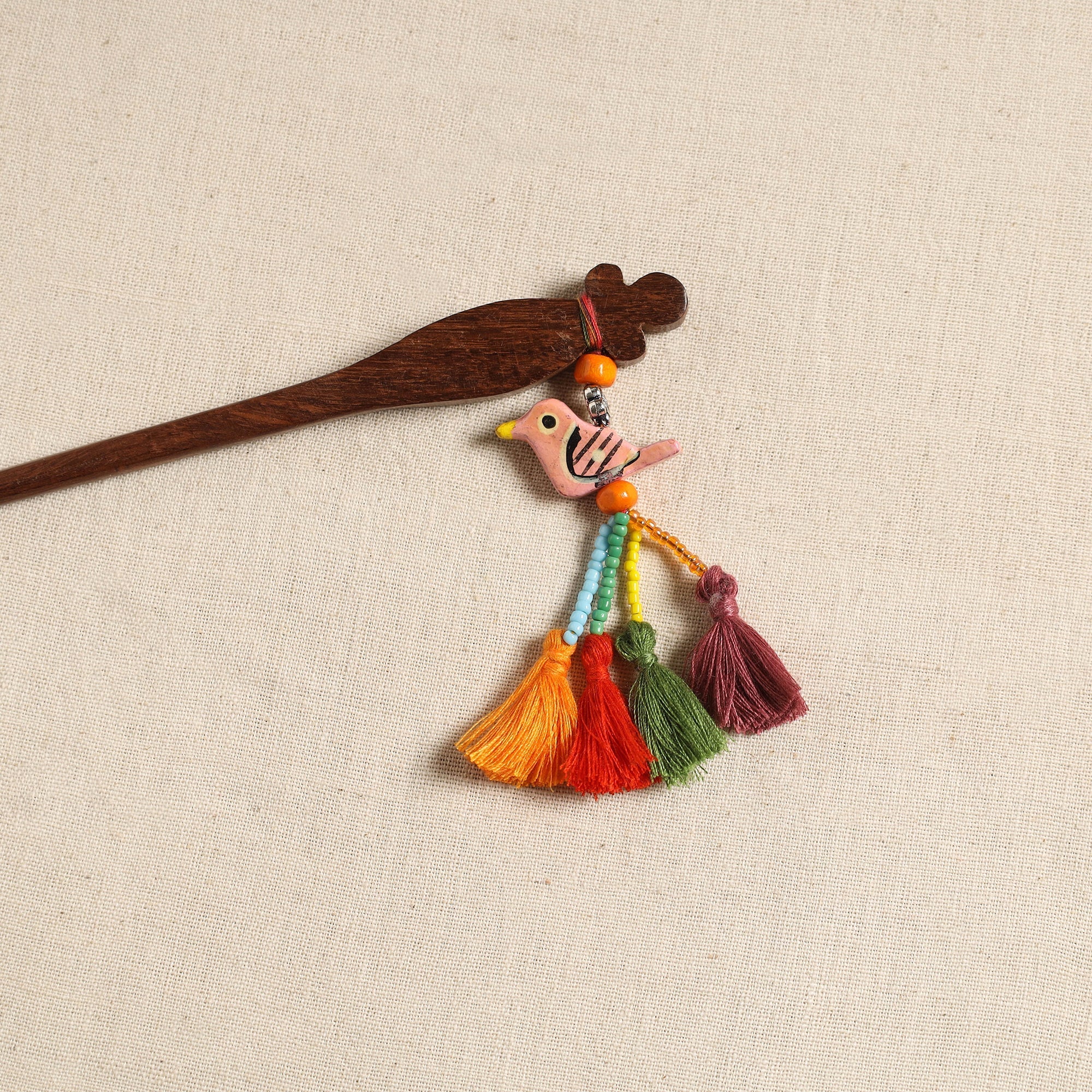 This bird tassel brown juda stick adds a graceful, eye-catching touch to your hairstyle. Made using a wooden base, it features intricate artisan-made details that may include beads, thread work, a hand-painted bird or other decorative elements, reflecting the unique creativity of the maker. Perfect for festive looks, wedding hairstyles or even everyday styling.