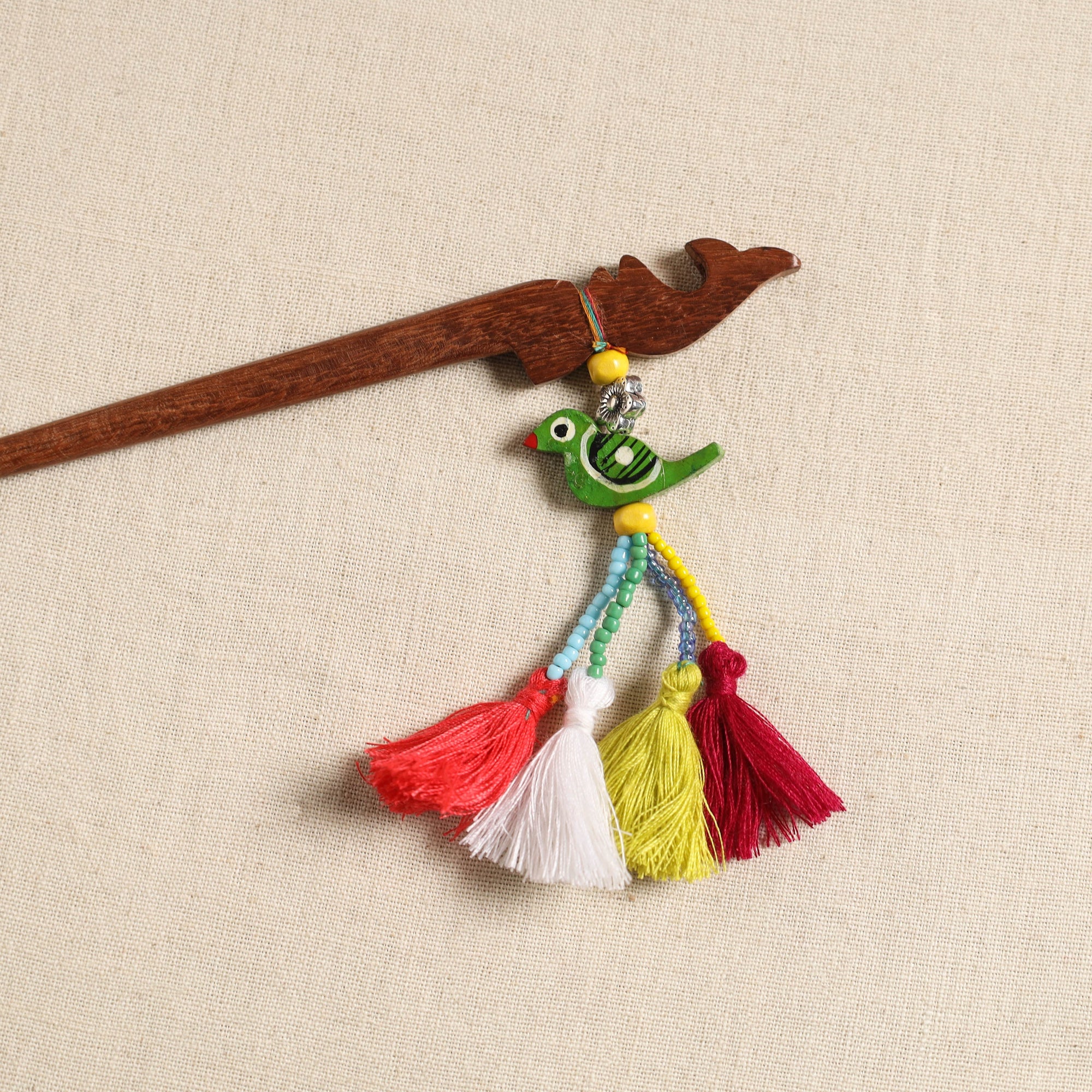 This bird tassel brown juda stick adds a graceful, eye-catching touch to your hairstyle. Made using a wooden base, it features intricate artisan-made details that may include beads, thread work, a hand-painted bird or other decorative elements, reflecting the unique creativity of the maker. Perfect for festive looks, wedding hairstyles or even everyday styling.