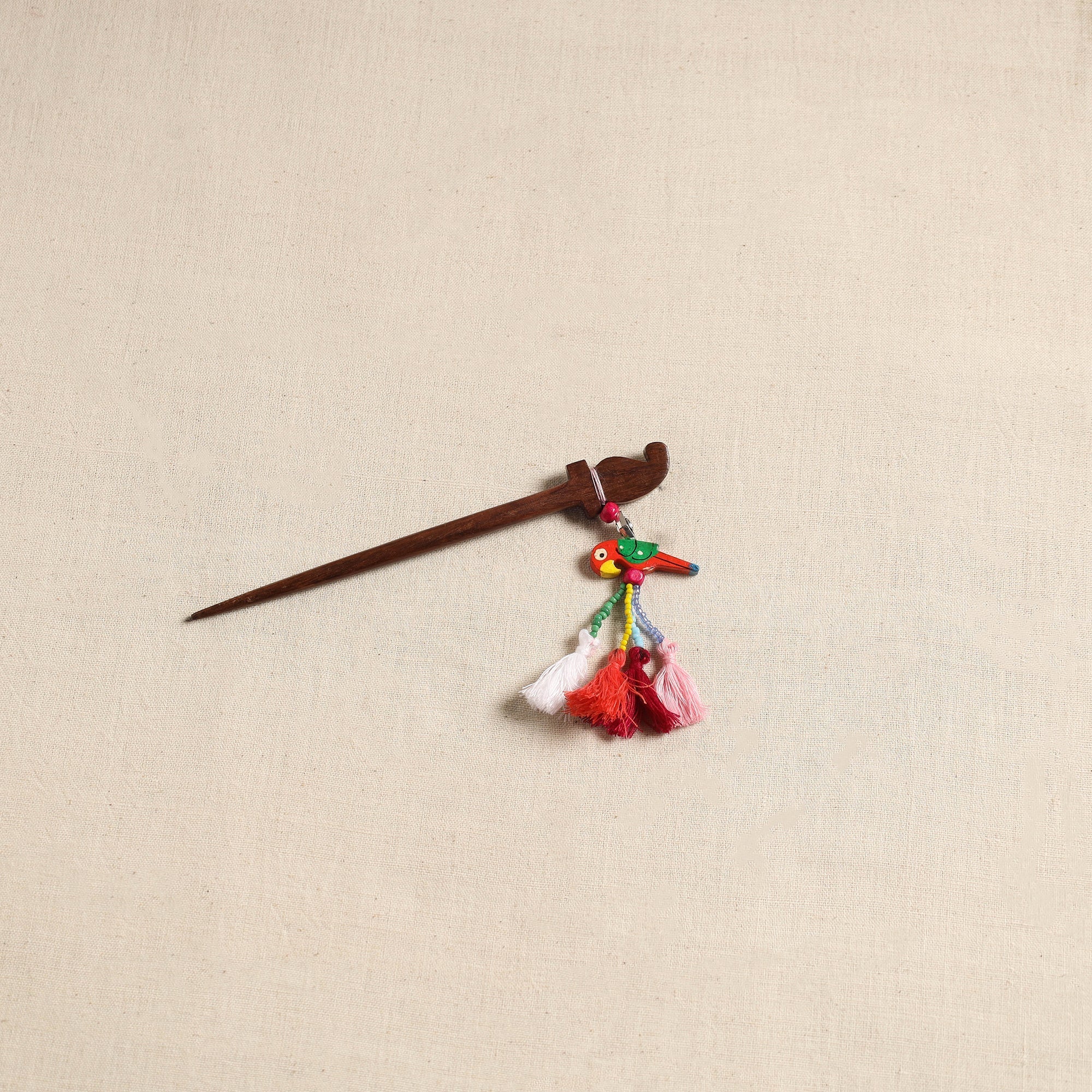 This bird tassel brown juda stick adds a graceful, eye-catching touch to your hairstyle. Made using a wooden base, it features intricate artisan-made details that may include beads, thread work, a hand-painted bird or other decorative elements, reflecting the unique creativity of the maker. Perfect for festive looks, wedding hairstyles or even everyday styling.