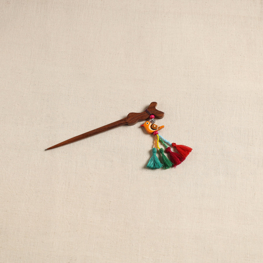 This bird tassel brown juda stick adds a graceful, eye-catching touch to your hairstyle. Made using a wooden base, it features intricate artisan-made details that may include beads, thread work, a hand-painted bird or other decorative elements, reflecting the unique creativity of the maker. Perfect for festive looks, wedding hairstyles or even everyday styling.