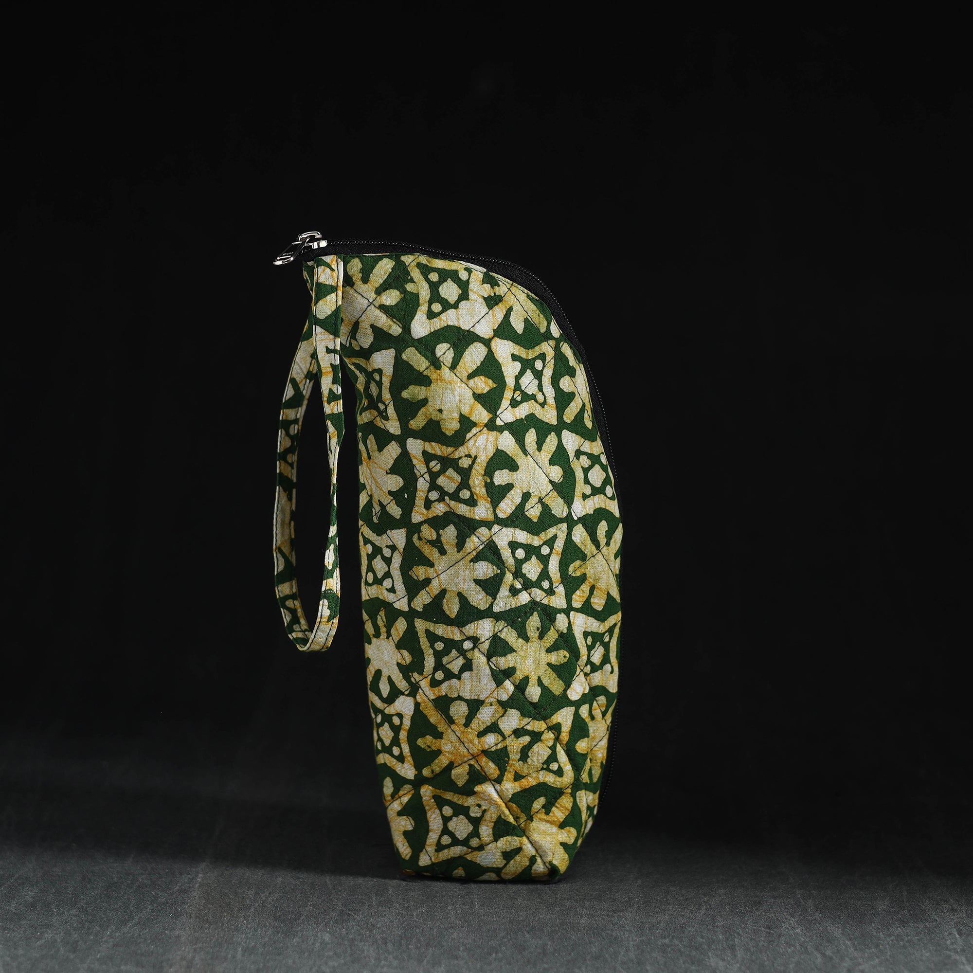 This handmade green cotton water bottle cover is designed to fit 1L bottles perfectly. It features a foam lining and a secure zipper closure to keep your bottle protected. The fabric is lightweight yet durable, making it a great choice for daily use and travel.