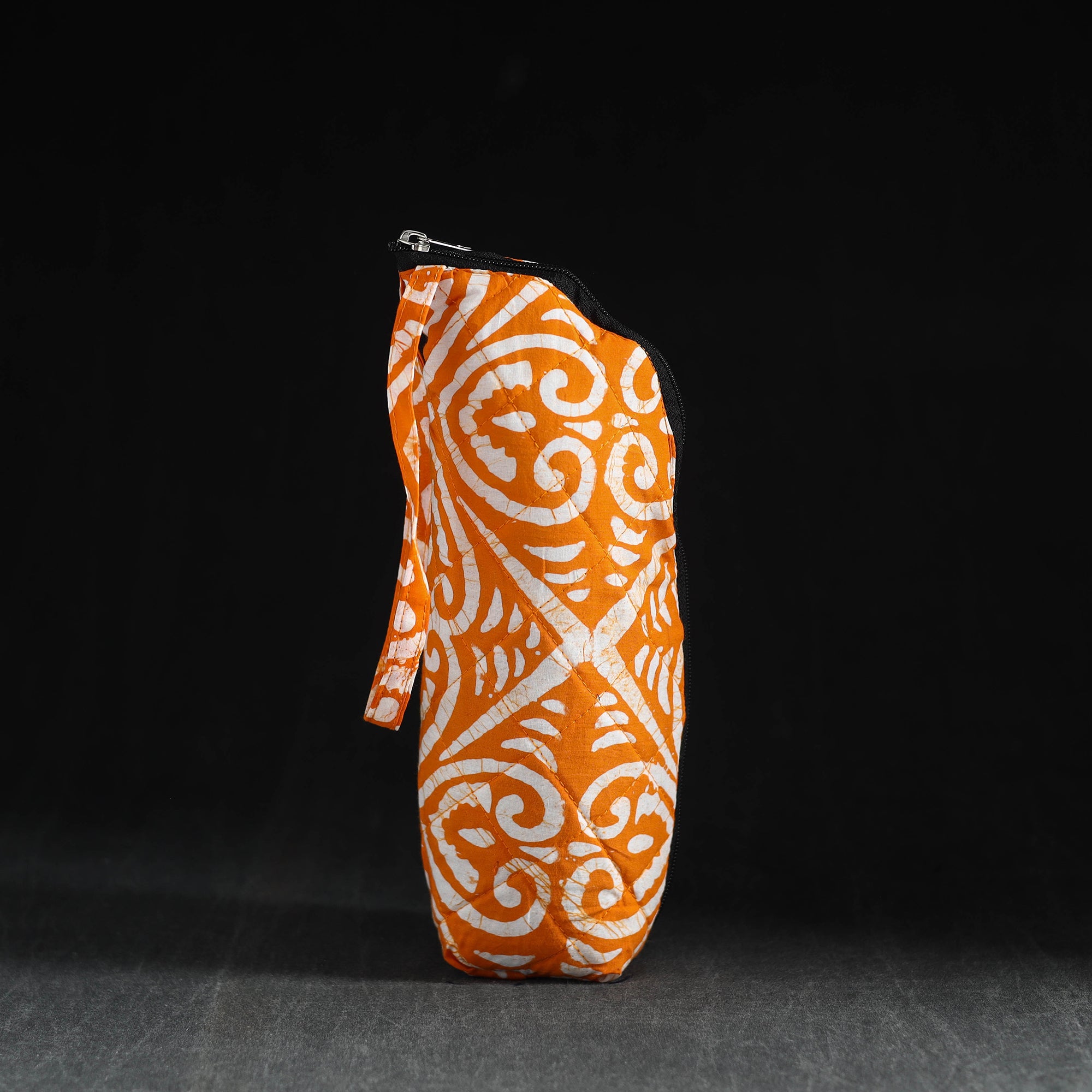 This handmade orange cotton water bottle cover is designed to fit 1L bottles perfectly. It features a foam lining and a secure zipper closure to keep your bottle protected. The fabric is lightweight yet durable, making it a great choice for daily use and travel.