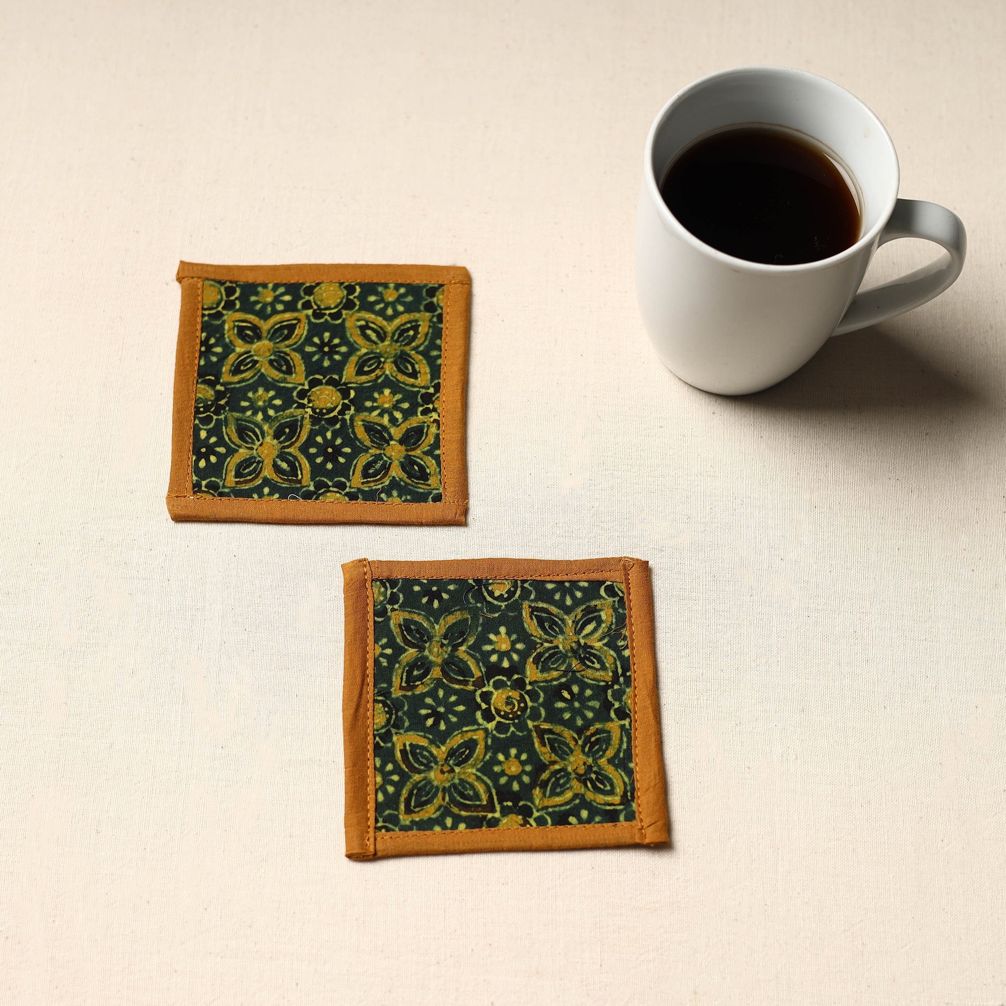 Bring a touch of handmade charm to your table with these green cotton coasters (set of 2). Crafted by skilled artisans using traditional Indian techniques, each piece features vibrant patterns and thoughtful design. Ideal for art lovers and eco-conscious homes.