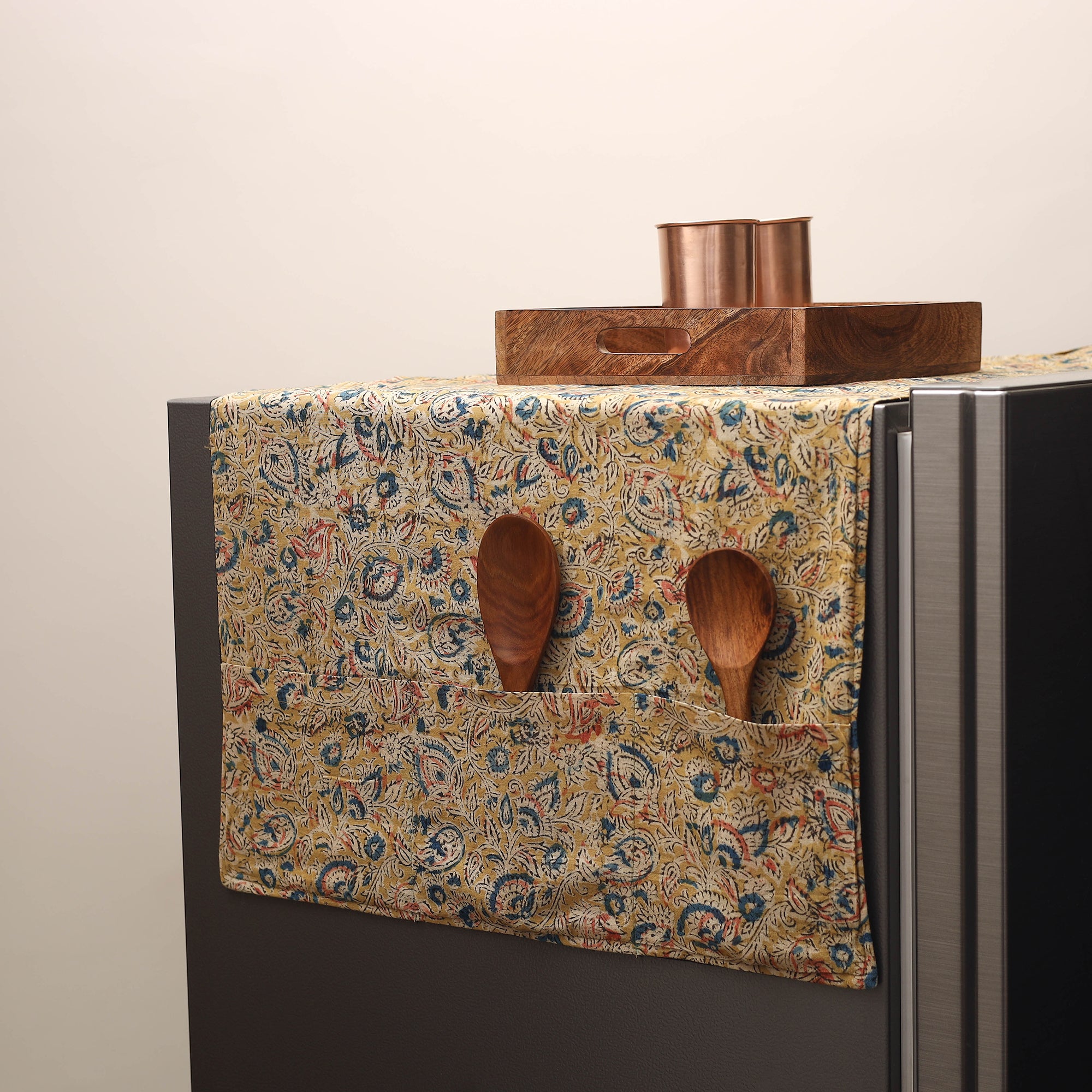 Infuse your kitchen with ethnic elegance using this yellow cotton fridge top cover, made from artisanal Indian fabrics. It safeguards your fridge from daily dust and scratches, while six handy pockets offer practical storage for quick-access items you use every day.