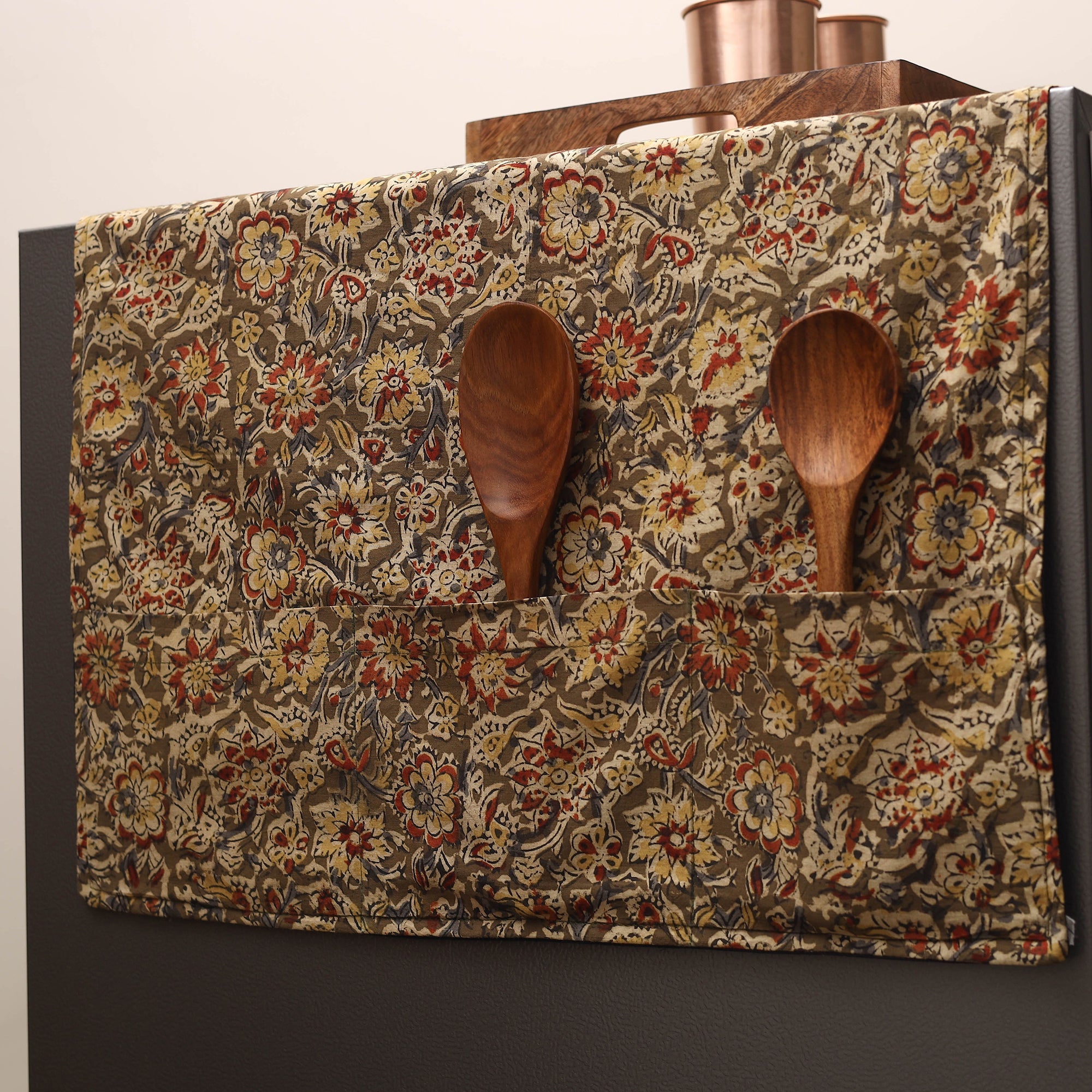 Infuse your kitchen with ethnic elegance using this brown cotton fridge top cover, made from artisanal Indian fabrics. It safeguards your fridge from daily dust and scratches, while six handy pockets offer practical storage for quick-access items you use every day.