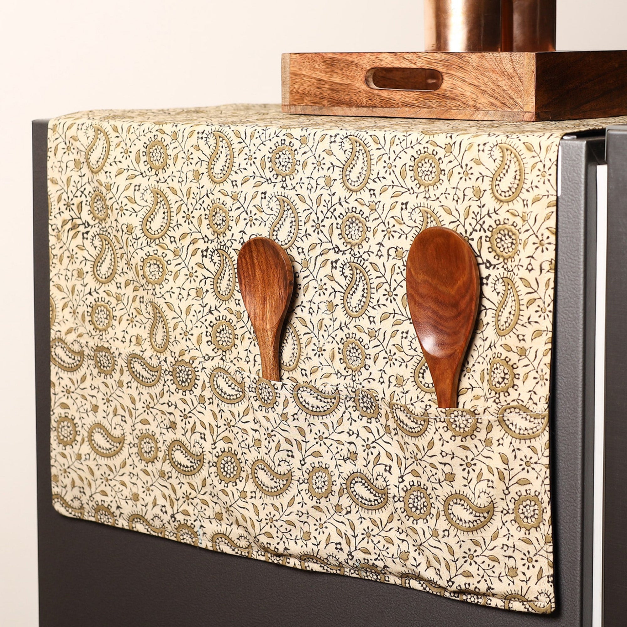Infuse your kitchen with ethnic elegance using this beige cotton fridge top cover made from artisanal Indian fabrics. It protects your fridge from daily dust and scratches, while six handy pockets provide practical storage for everyday essentials.
