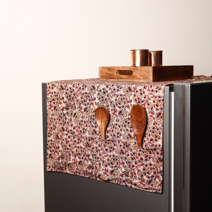 Infuse your kitchen with ethnic elegance using this beige cotton fridge top cover made from artisanal Indian fabrics. It protects your fridge from daily dust and scratches, while six handy pockets provide practical storage for everyday essentials.