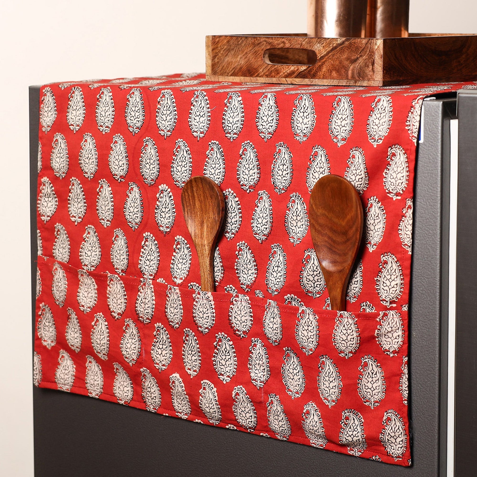 Infuse your kitchen with ethnic elegance using this red cotton fridge top cover made from artisanal Indian fabrics. It protects your fridge from daily dust and scratches, while six handy pockets provide practical storage for everyday essentials.