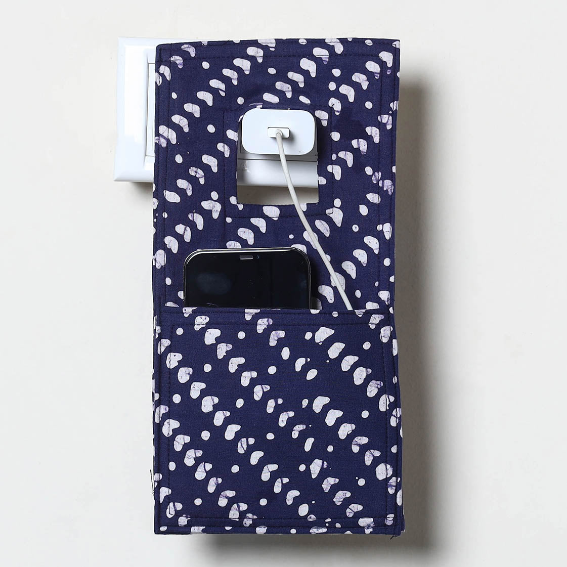This blue handmade mobile charging holder is crafted from durable cotton fabric and offers a smart way to hold your phone while charging. Created by skilled artisans, it keeps your device secure whether at home or during travel. Lightweight and travel-friendly, it comfortably fits most phone sizes.