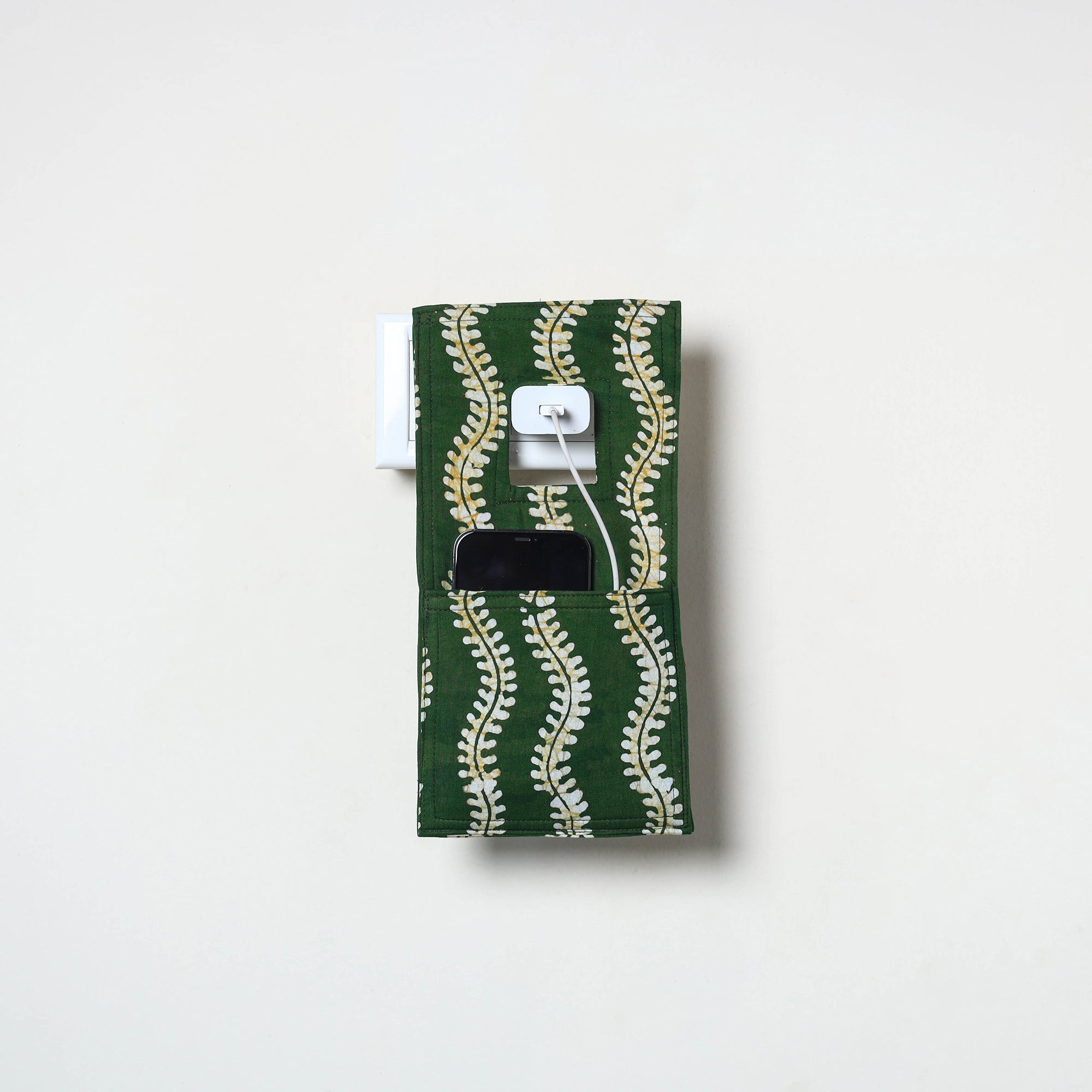 This green handmade mobile charging holder is crafted from durable cotton fabric and offers a smart way to hold your phone while charging. Created by skilled artisans, it keeps your device secure whether at home or during travel. Lightweight and travel-friendly, it comfortably fits most phone sizes.