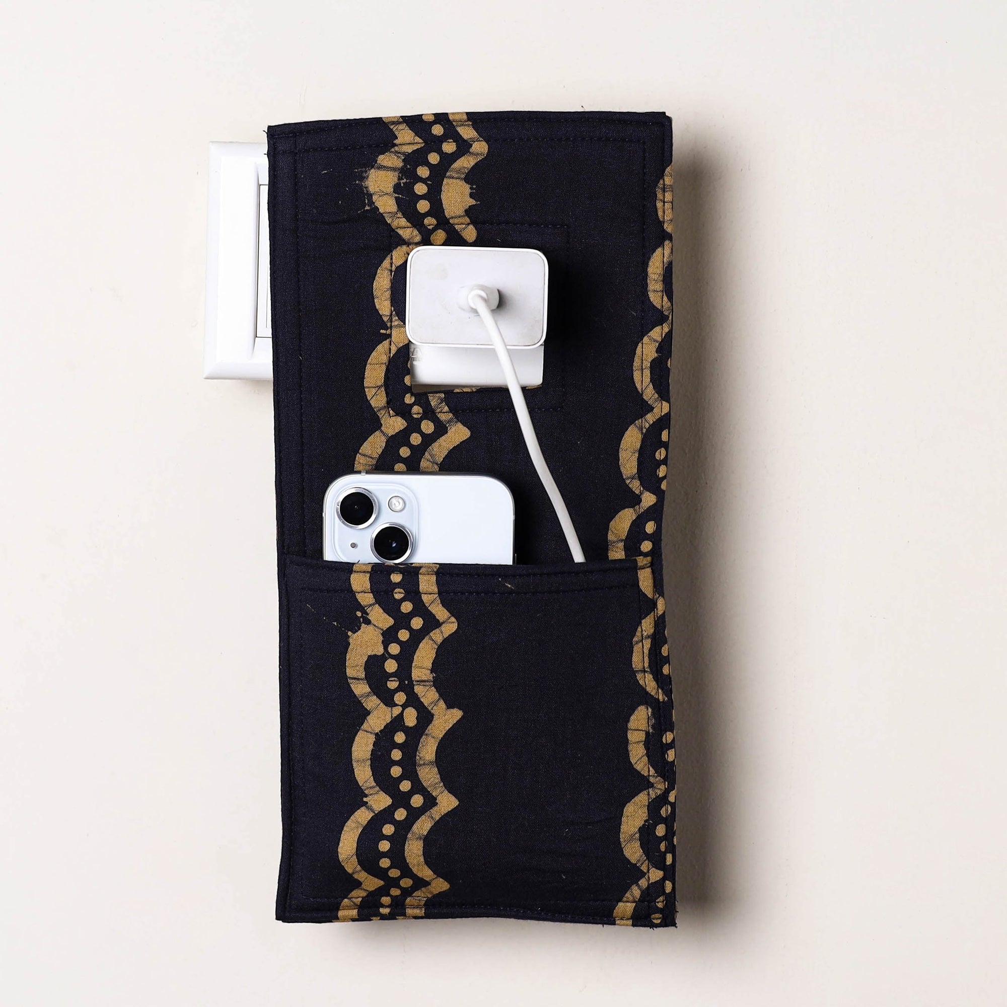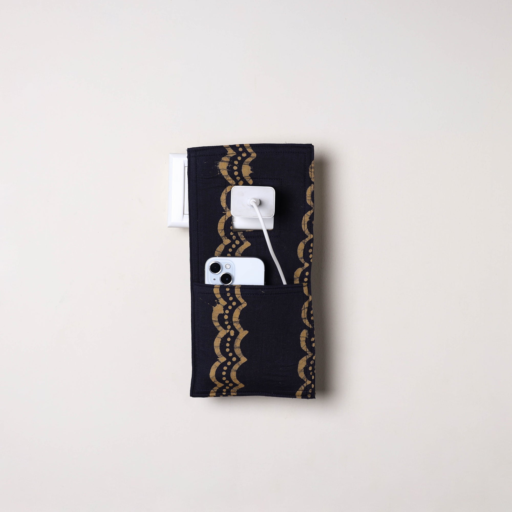This black handmade mobile charging holder is crafted from durable cotton fabric and features a convenient cut-out to hang directly on the plug. Designed with a deep front pocket, it securely holds your phone while charging. Created by skilled artisans, it’s lightweight, foldable, and travel-friendly, fitting most phone sizes. A practical pick for home, office, or travel use.