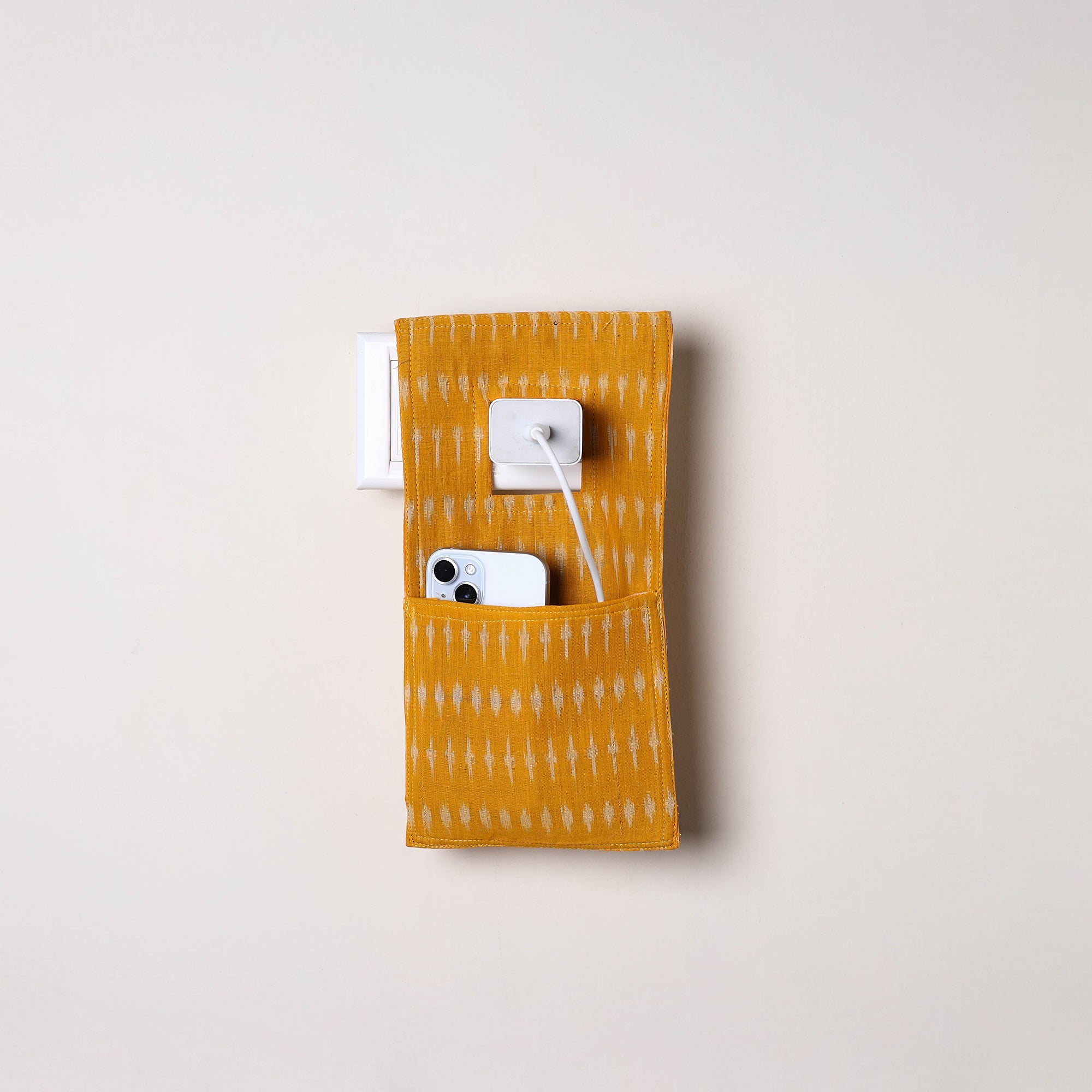 This yellow handmade mobile charging holder is crafted from durable cotton fabric and features a convenient cut-out to hang directly on the plug. Designed with a deep front pocket, it securely holds your phone while charging. Created by skilled artisans, it’s lightweight, foldable, and travel-friendly, fitting most phone sizes. A practical pick for home, office, or travel use.