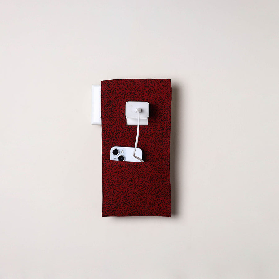 This maroon handmade mobile charging holder is crafted from durable cotton fabric and features a convenient cut-out to hang directly on the plug. Designed with a deep front pocket, it securely holds your phone while charging. Created by skilled artisans, it’s lightweight, foldable, and travel-friendly, fitting most phone sizes. A practical pick for home, office, or travel use.