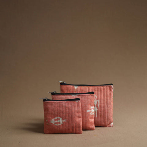 Keep your essentials organized with our peach handmade cotton multipurpose utility pouches (set of 3). The handcrafted bag set serves as a multipurpose solution for storing makeup, jewelry, medicines, stationery, and more. The foam layer lining ensures durability and protection. These pouches are having a smooth zipper closure.