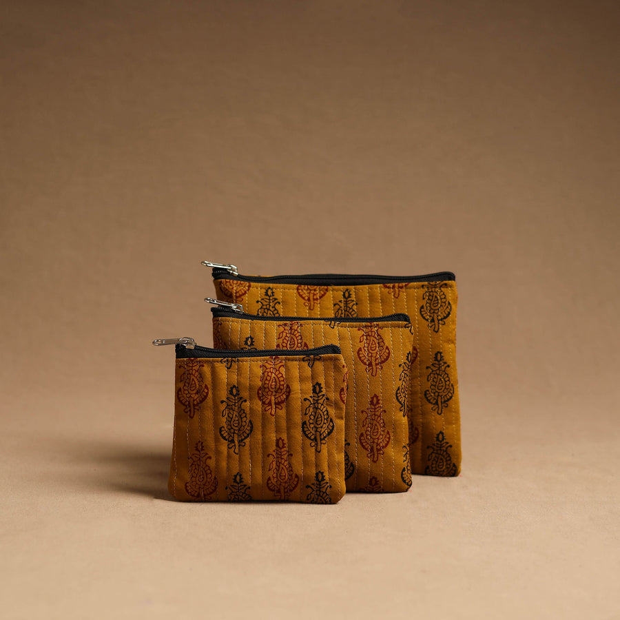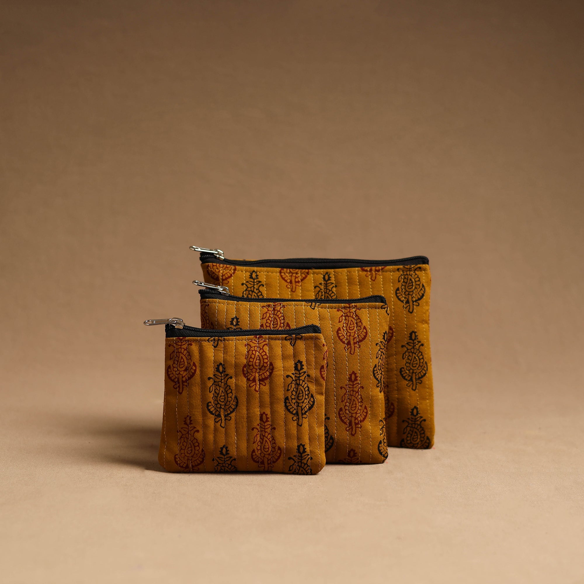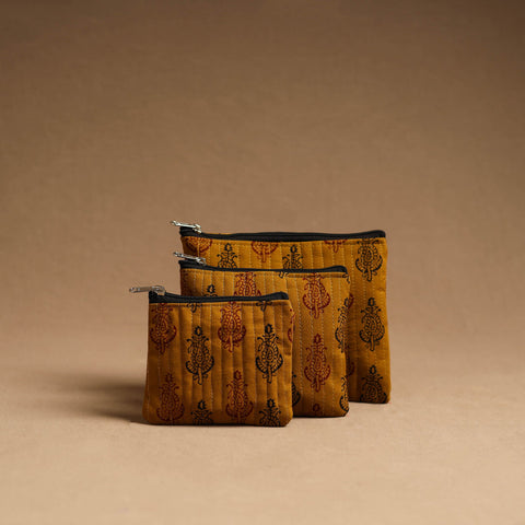Organize your essentials with this brown handmade cotton multipurpose utility pouches (set of 3). Ideal for storing makeup, jewelry, medicines, or stationery, these pouches offer both functionality and style. Crafted with care by artisans, they feature a foam layer lining for added protection and a smooth zipper closure for easy access.