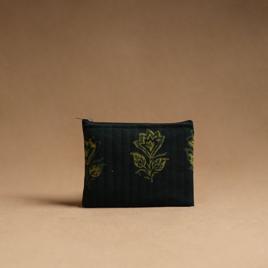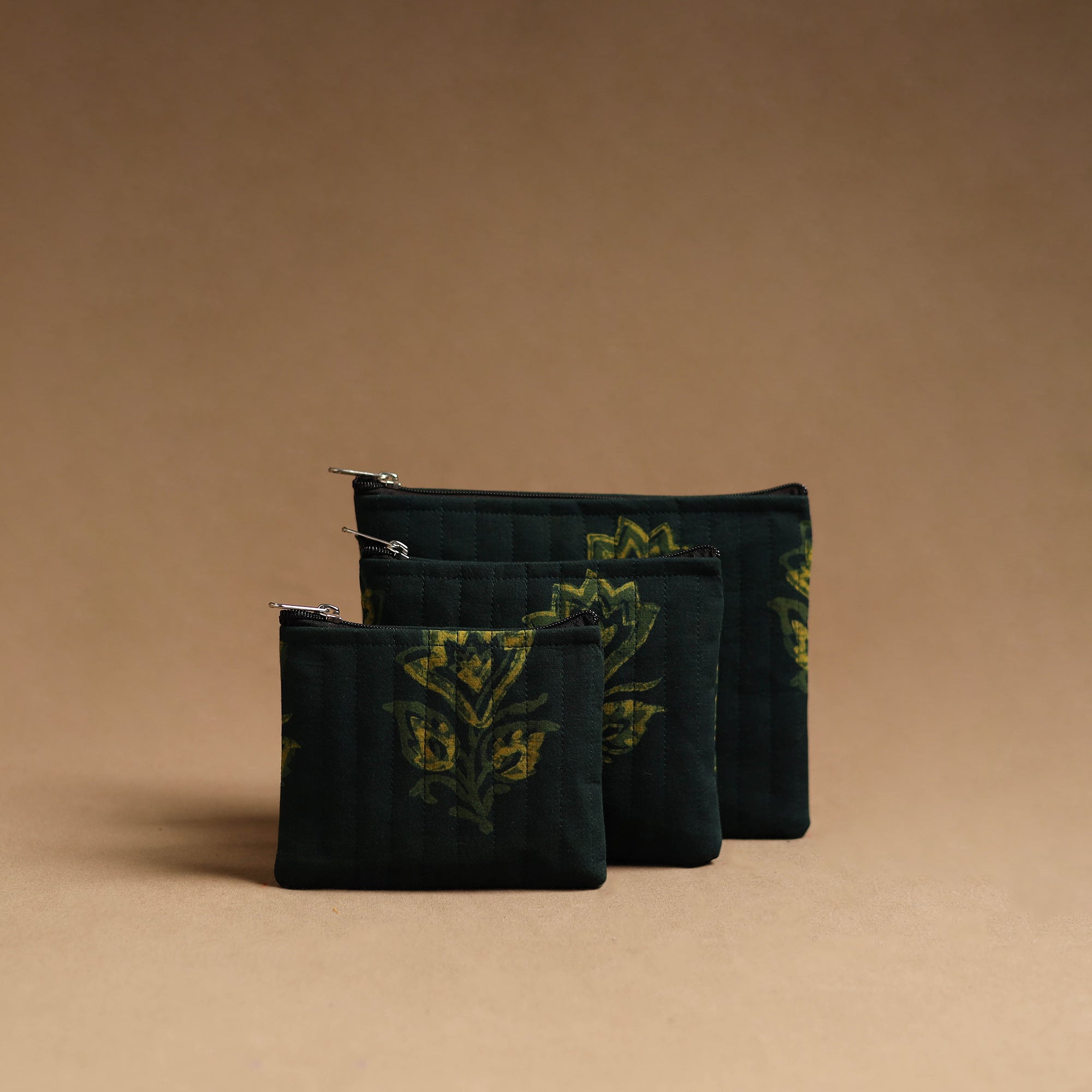 Organize your essentials with this green handmade cotton multipurpose utility pouches (set of 3). Ideal for storing makeup, jewelry, medicines, or stationery, these pouches offer both functionality and style. Crafted with care by artisans, they feature a foam layer lining for added protection and a smooth zipper closure for easy access.