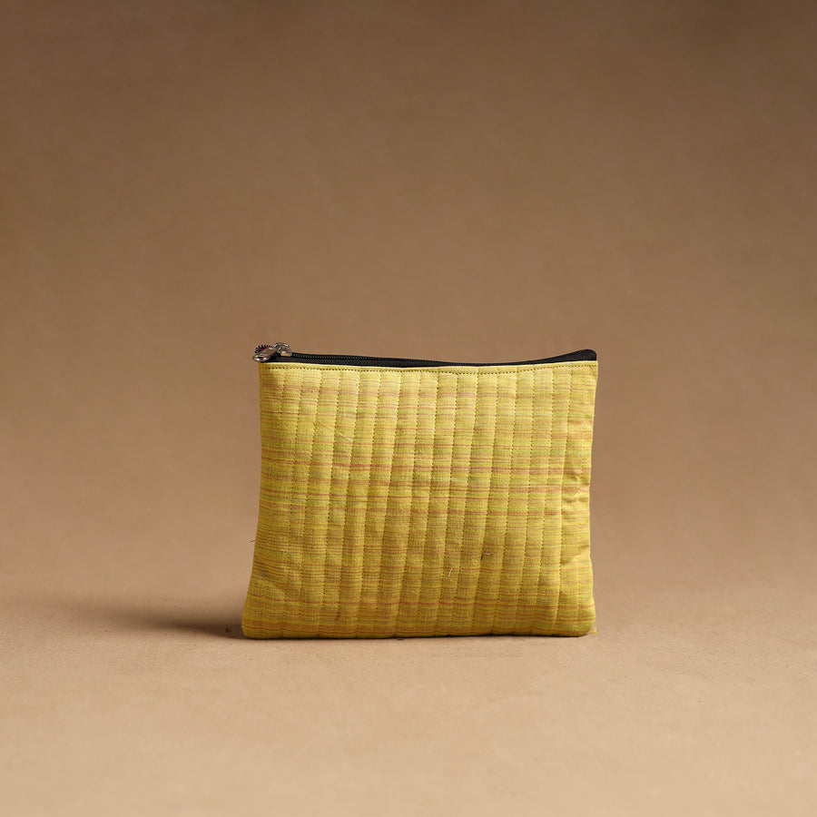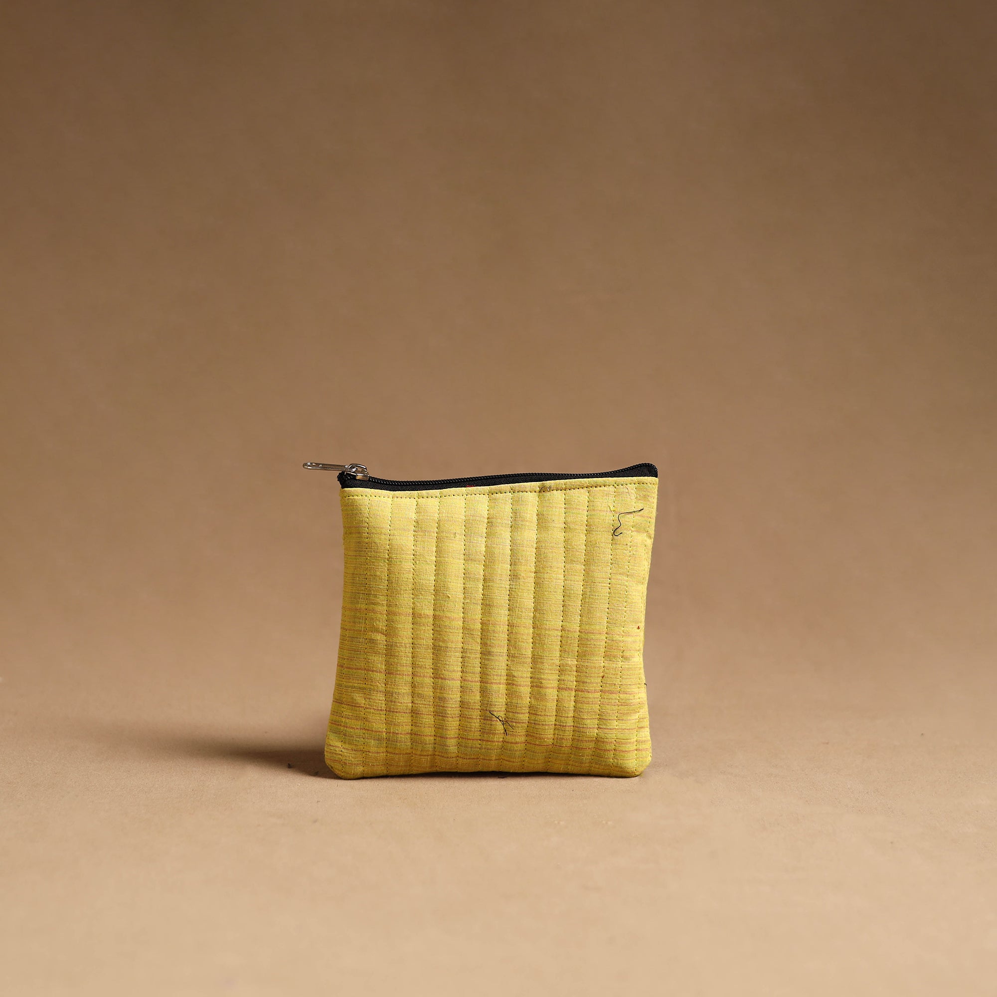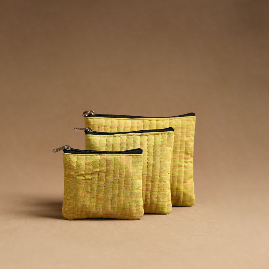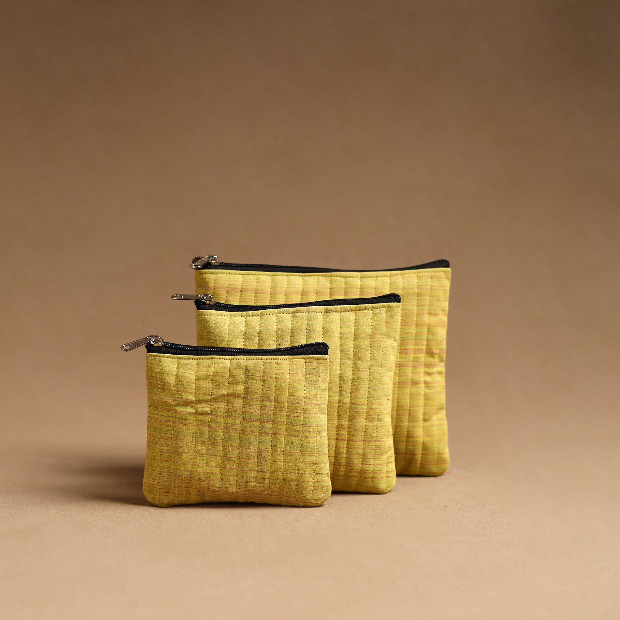 Organize your essentials with this yellow handmade cotton multipurpose utility pouches (set of 3). Ideal for storing makeup, jewelry, medicines, or stationery, these pouches offer both functionality and style. Crafted with care by artisans, they feature a foam layer lining for added protection and a smooth zipper closure for easy access.