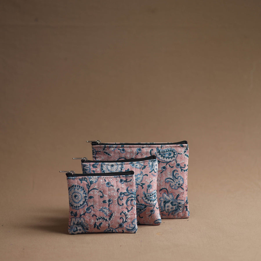 Keep your essentials organized with our pink handmade cotton multipurpose utility pouches (set of 3). The handcrafted bag set serves as a multipurpose solution for storing makeup, jewelry, medicines, stationery, and more. The foam layer lining ensures durability and protection. These pouches are having a smooth zipper closure.