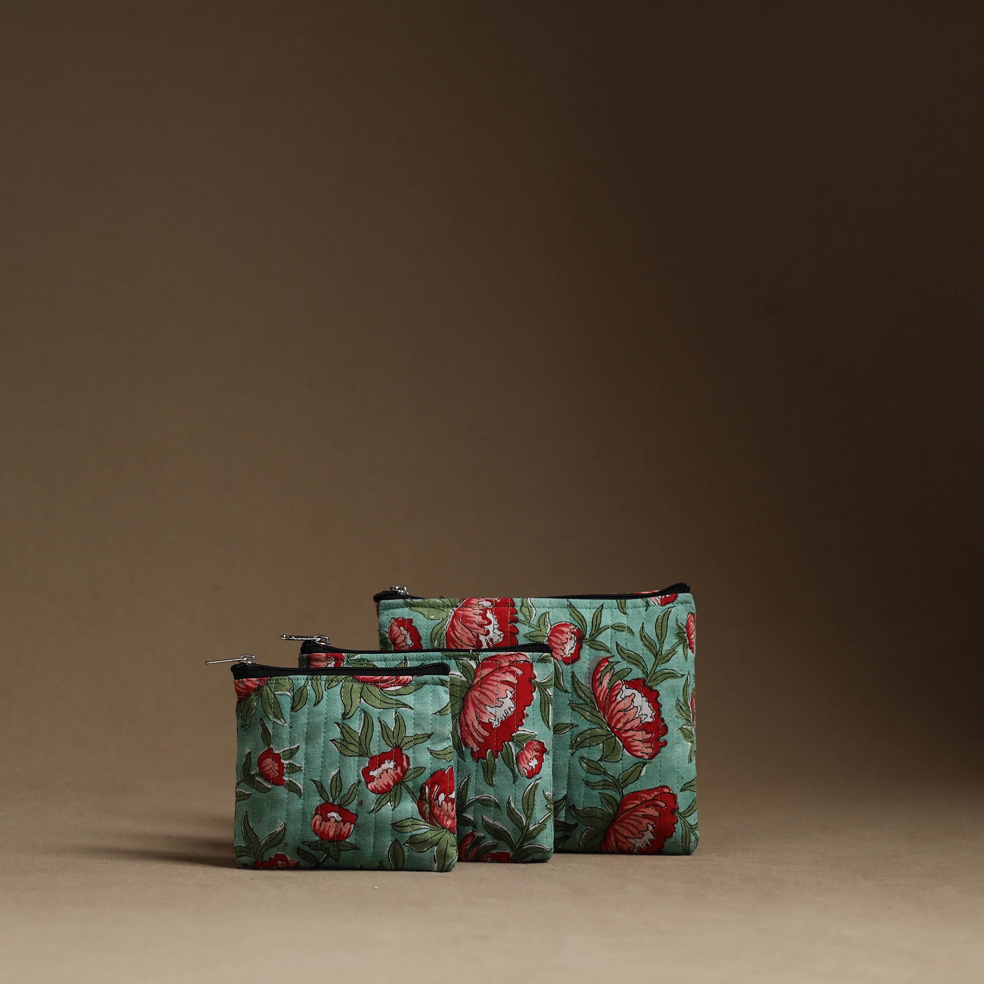 Keep your essentials organized with our green handmade cotton utility pouch set. The handcrafted bag set serves as a multipurpose solution for storing makeup, jewelry, medicines, stationery, and more. The foam layer lining ensures durability and protection. These eco-friendly pouches are both stylish and functional. These pouches are having a smooth zipper closure.