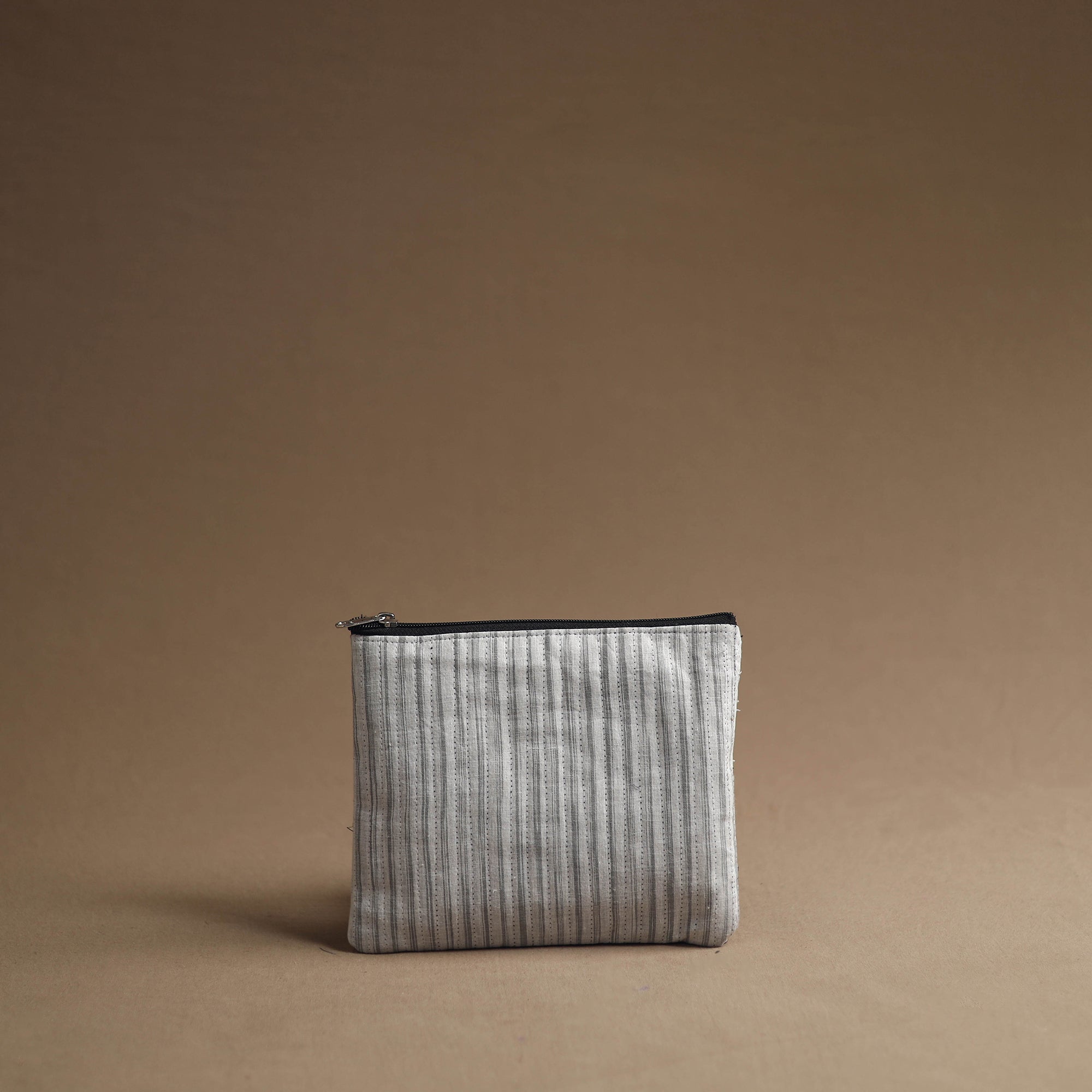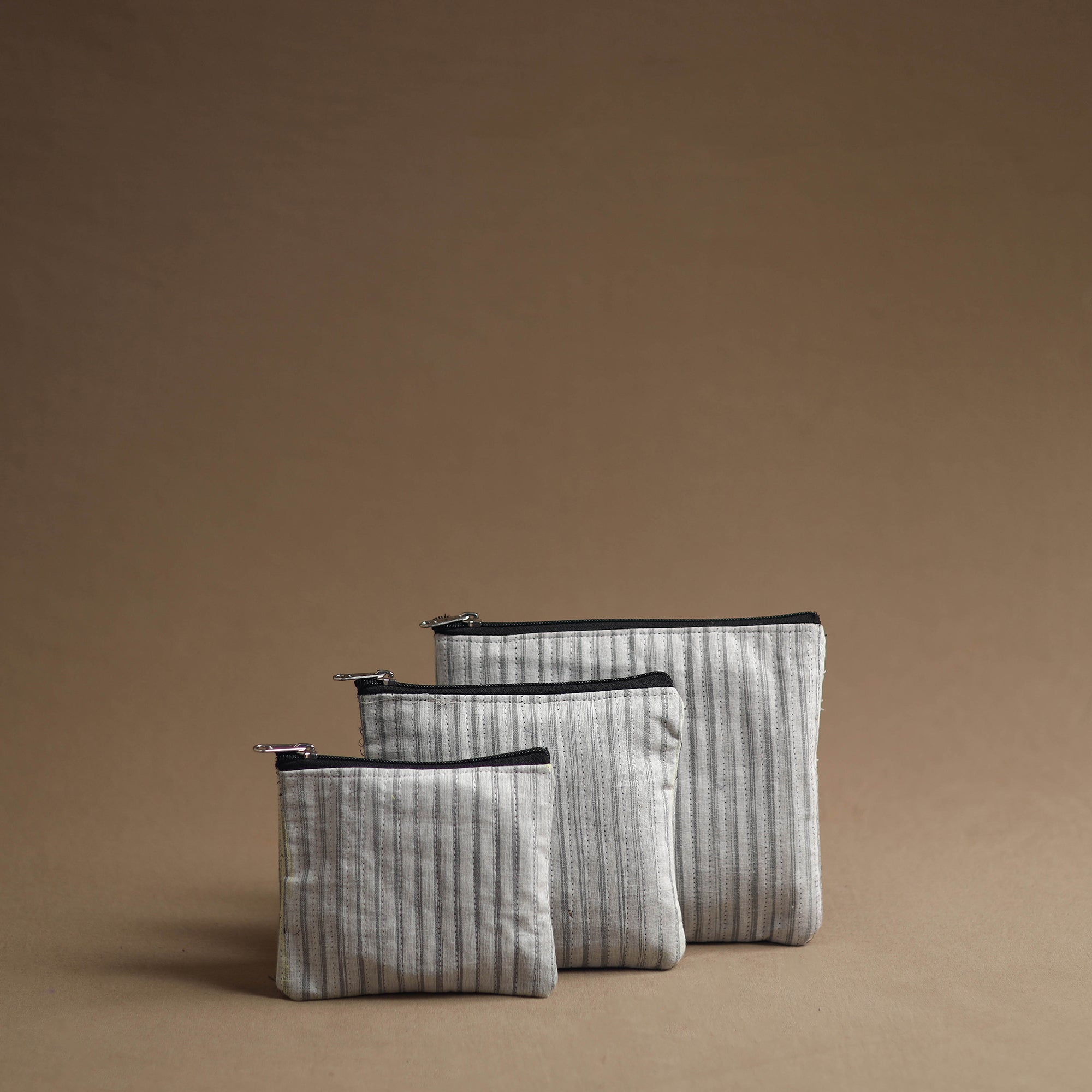 Keep your essentials organized with our white handmade cotton multipurpose utility pouches (set of 3). The handcrafted bag set serves as a multipurpose solution for storing makeup, jewelry, medicines, stationery, and more. The foam layer lining ensures durability and protection. These pouches are having a smooth zipper closure.