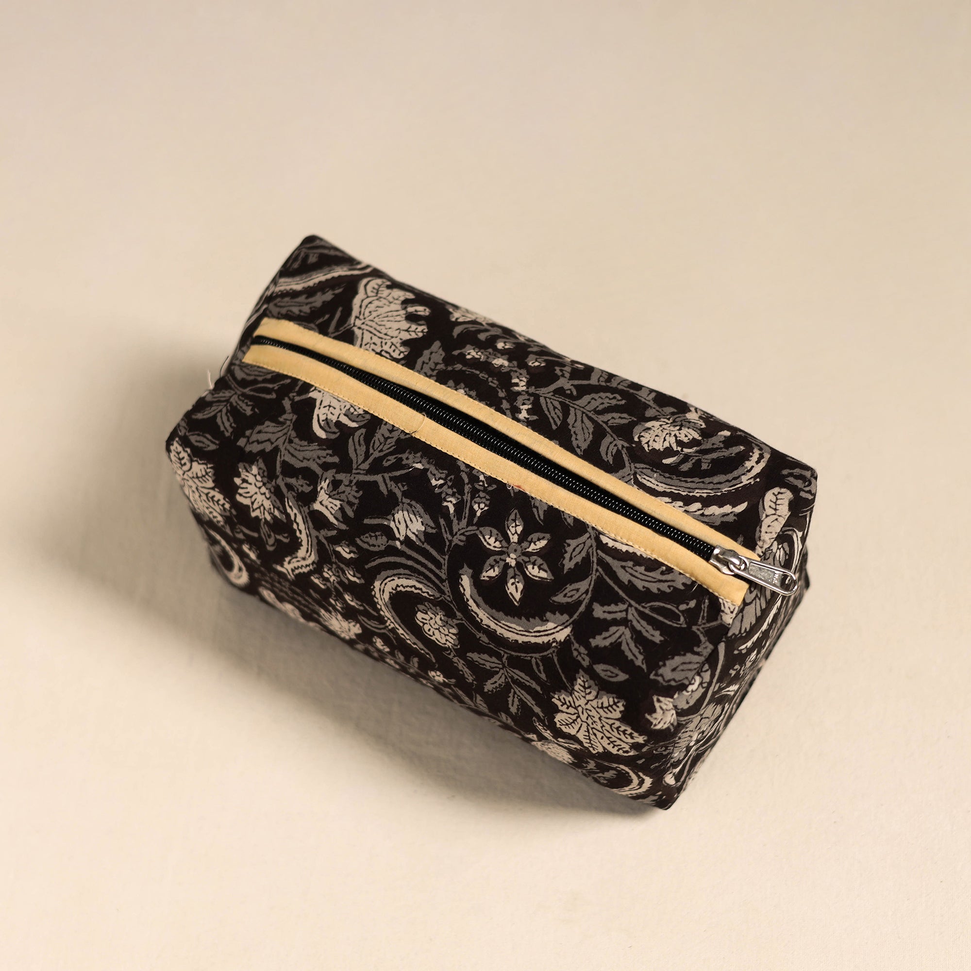 This handcrafted black cotton toiletry bag blends traditional artistry with everyday functionality, made carefully by skilled hands. Featuring a waterproof lining and a strong zip closure, it keeps your daily essentials well organized and protected, making it an ideal pick for both daily use and travel.