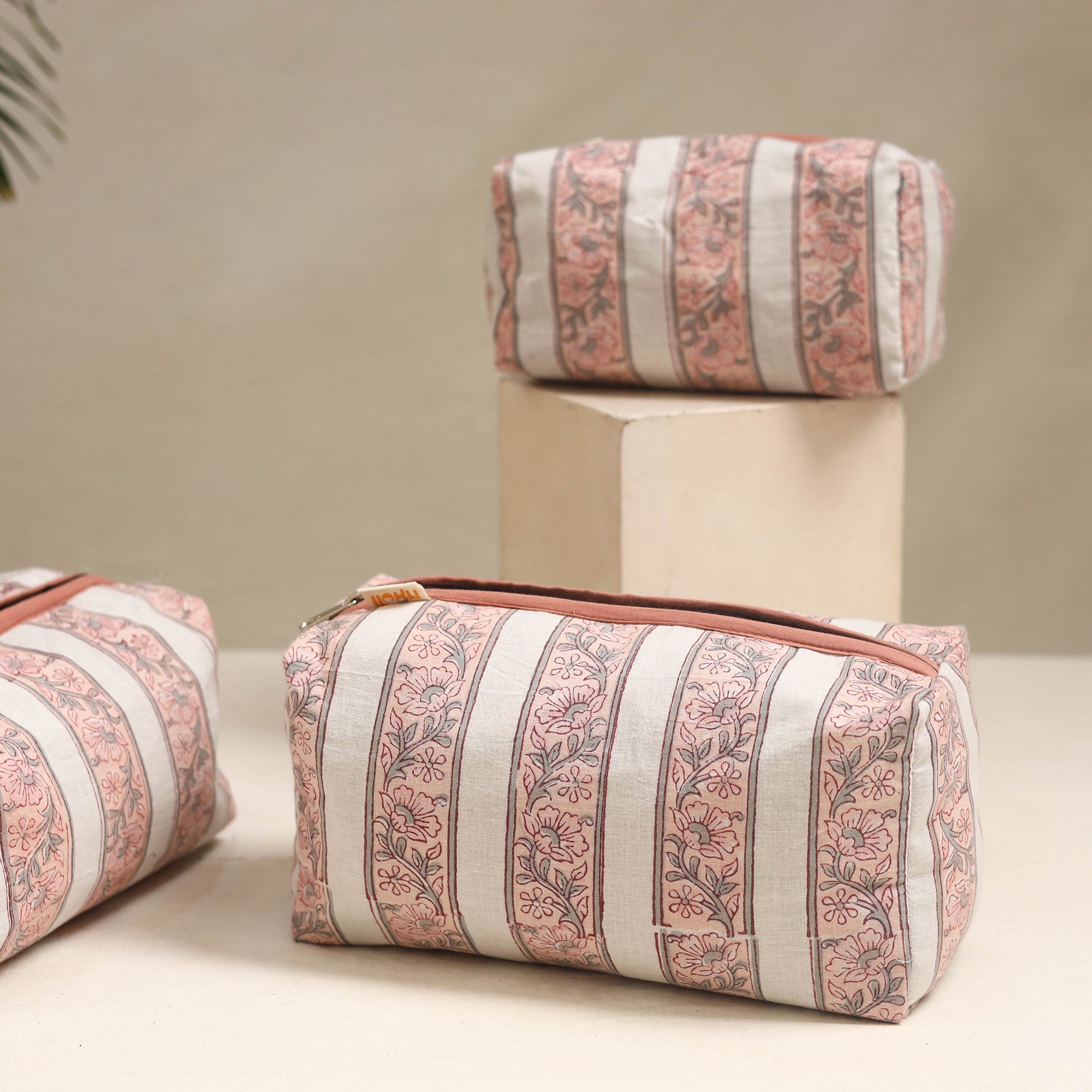 Keep your travel essentials organized with this beautiful white set of 3 handmade cotton toiletry bags, crafted with care by artisans. Each bag features a waterproof lining, perfect for storing cosmetics, toiletries, or travel essentials. Made from Indian handmade fabric, this set offers everyday ease with a touch of charm.