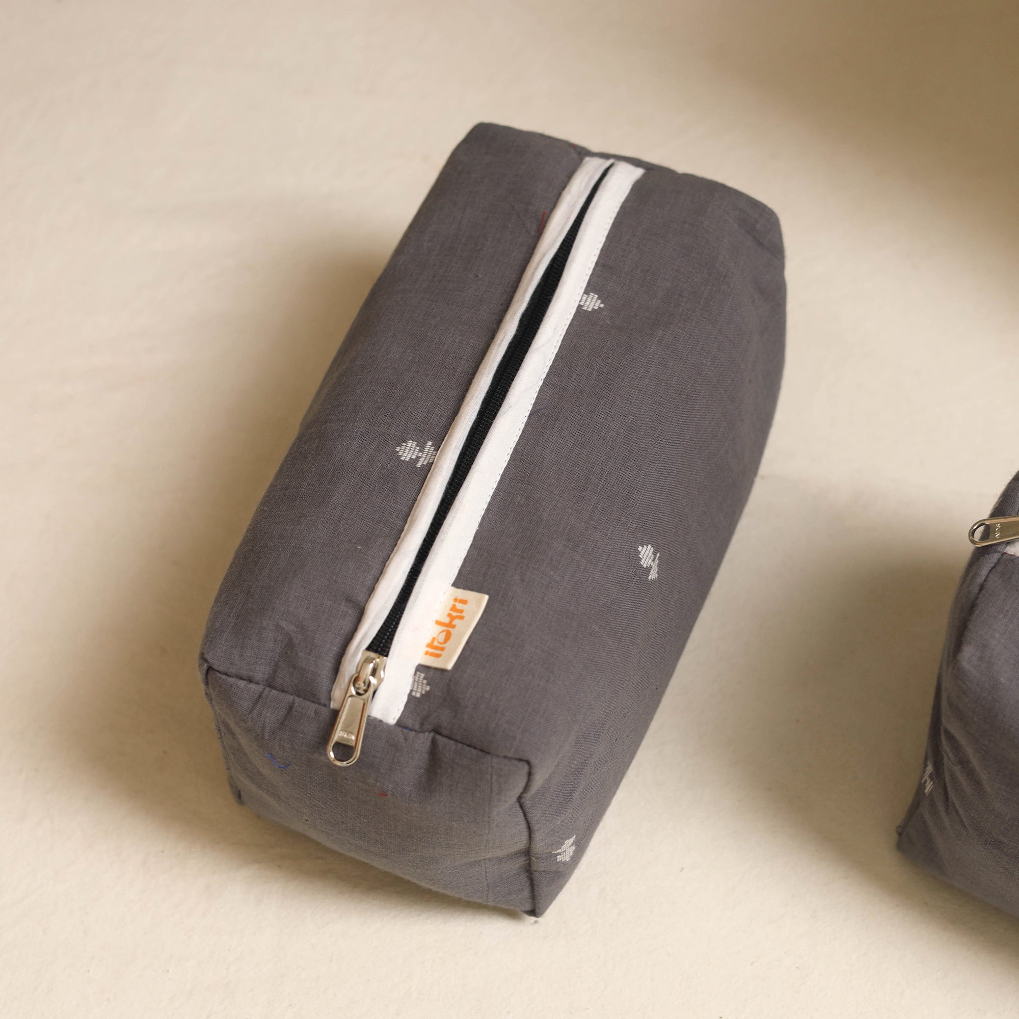 Keep your travel essentials organized with this beautiful grey set of 3 handmade cotton toiletry bags, crafted with care by artisans. Each bag features a waterproof lining, perfect for storing cosmetics, toiletries, or travel essentials. Made from Indian handmade fabric, this set offers everyday ease with a touch of charm.