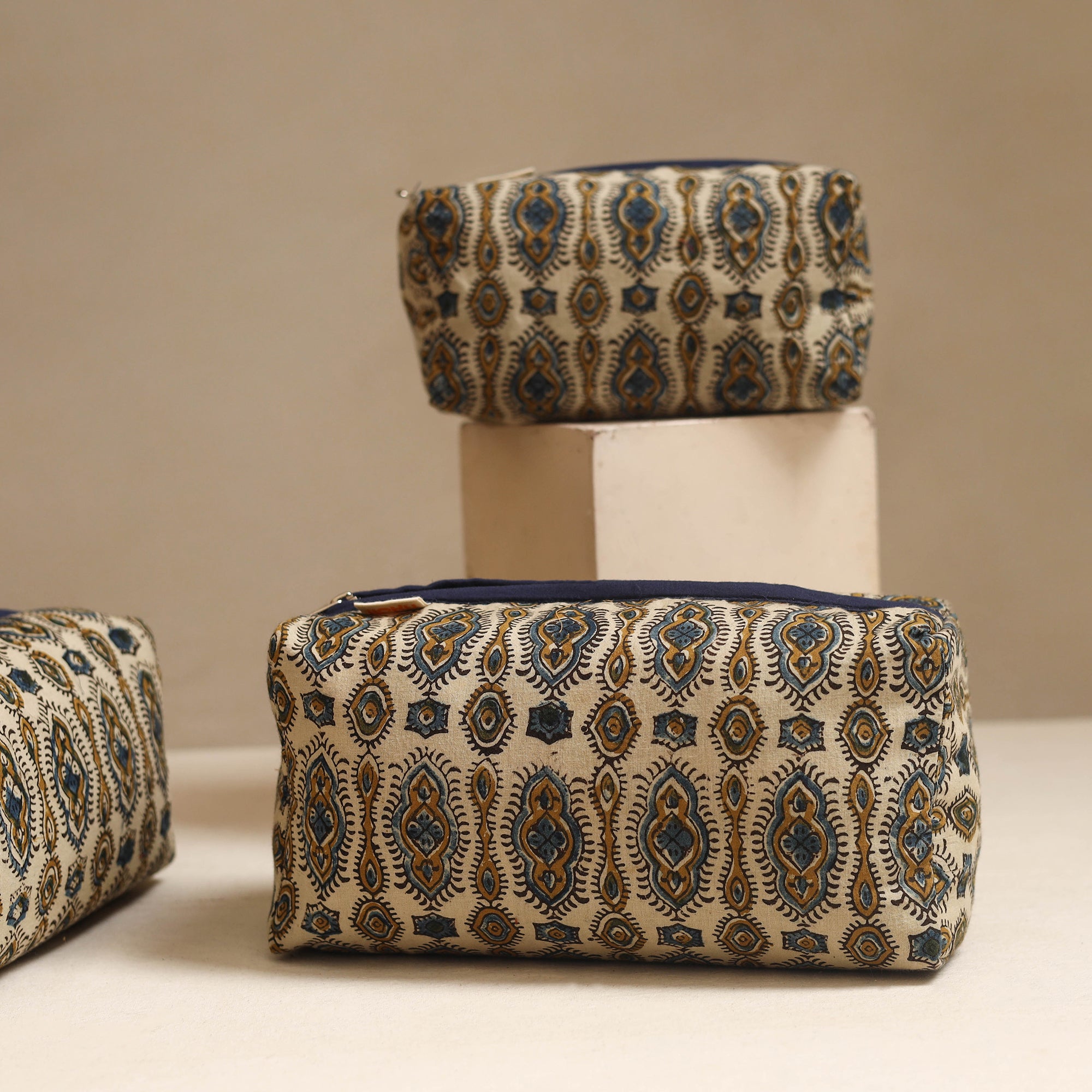 Keep your travel essentials organized with this beautiful beige set of 3 handmade cotton toiletry bags, crafted with care by artisans. Each bag features a waterproof lining, perfect for storing cosmetics, toiletries, or travel essentials. Made from Indian handmade fabric, this set offers everyday ease with a touch of charm.