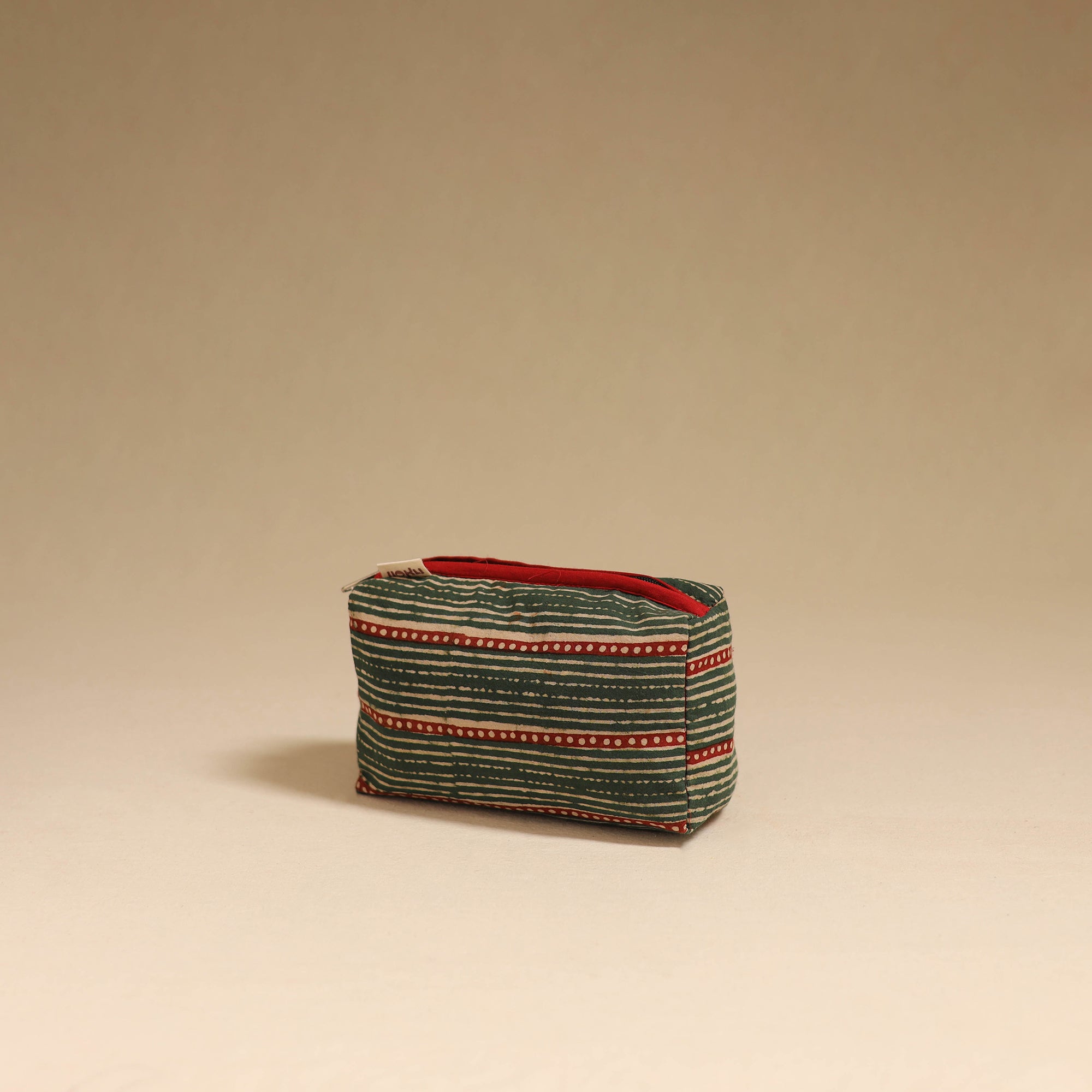 This green handmade cotton toiletry pouch blends traditional artistry with everyday functionality, carefully made by skilled artisans. Featuring a waterproof lining and a sturdy zip closure, it keeps your daily essentials well-organized and protected, making it a perfect choice for both daily use and travel.